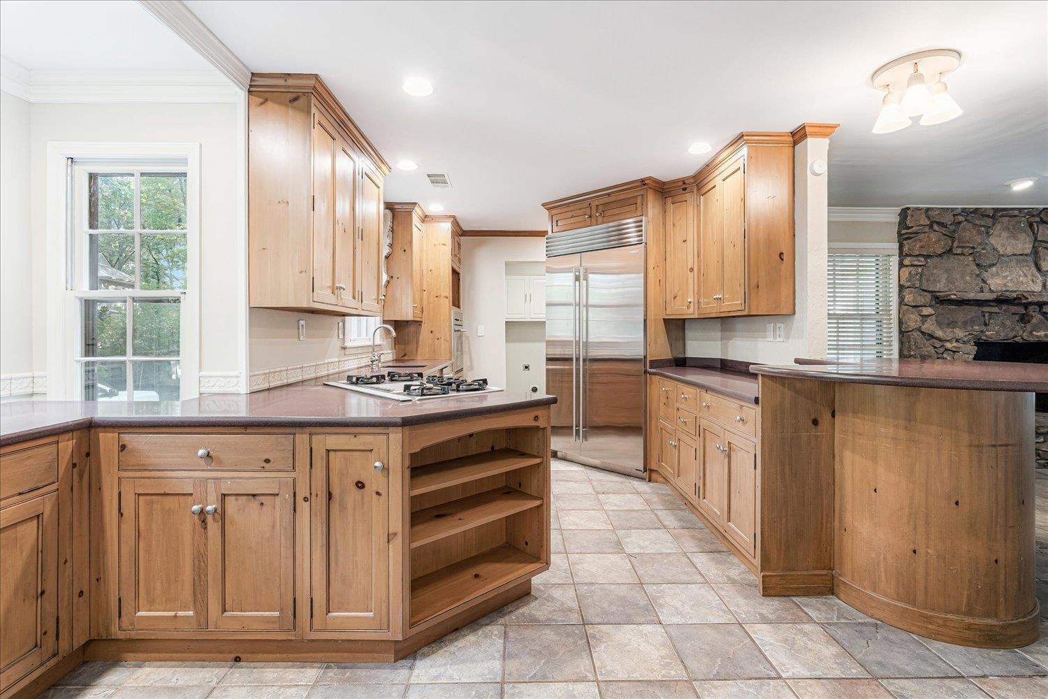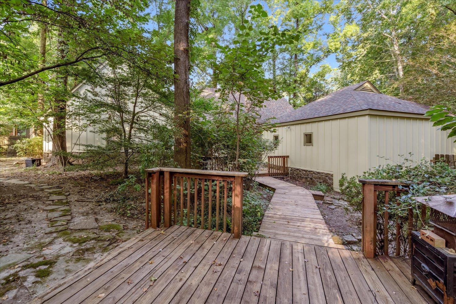 Cottage-like home with an inground pool in a beautiful treed cove. Recent updates include: a new roof (3 yrs ago), James Hardie siding w/fresh paint (2025), HVAC with central air purifiers (2025), water heaters (2024), chimney lining and architectural cap. The pool liner was replaced 3 years ago. Pool pump replaced (2025). The kitchen is a chef's delight featuring a gas cooktop, Sub-Zero refrigerator and stainless-steel appliances. The vaulted dining room opens to a welcoming large family room with a cozy stone fireplace. Downstairs has 3 bedrooms and 2.5 baths and upstairs offers 2 bedrooms, 1 bath and a large walk-in attic. Throughout the home is warm hardwood and tile flooring, central vacuum wall outlets and a freshly painted interior which feels bright and welcoming. Enjoy the sunroom connecting to the patio and decking that lead to the pool. The garden has a variety of native plants and trees making it a nature lover's delight. Ready for immediate occupancy!!!!!