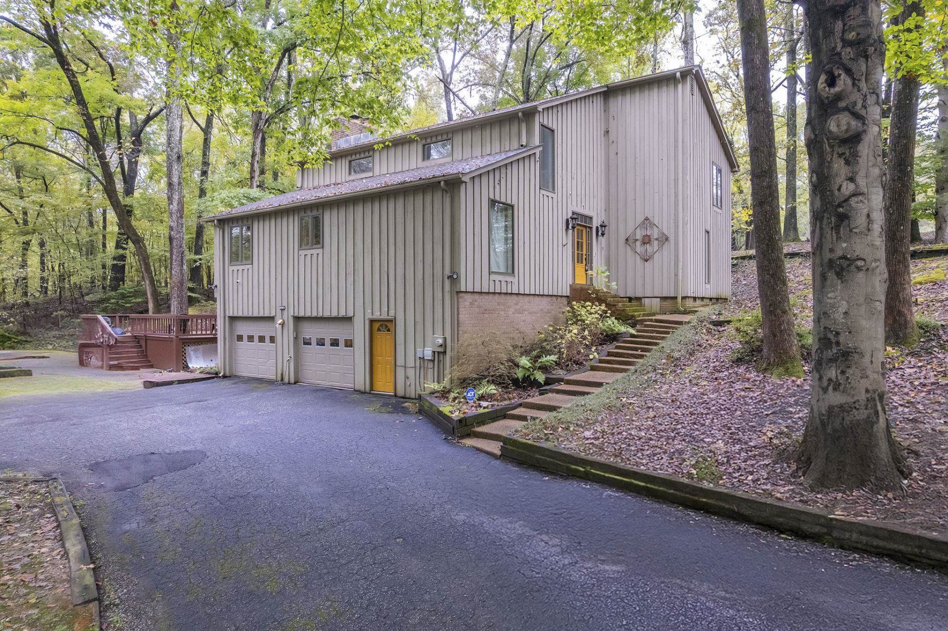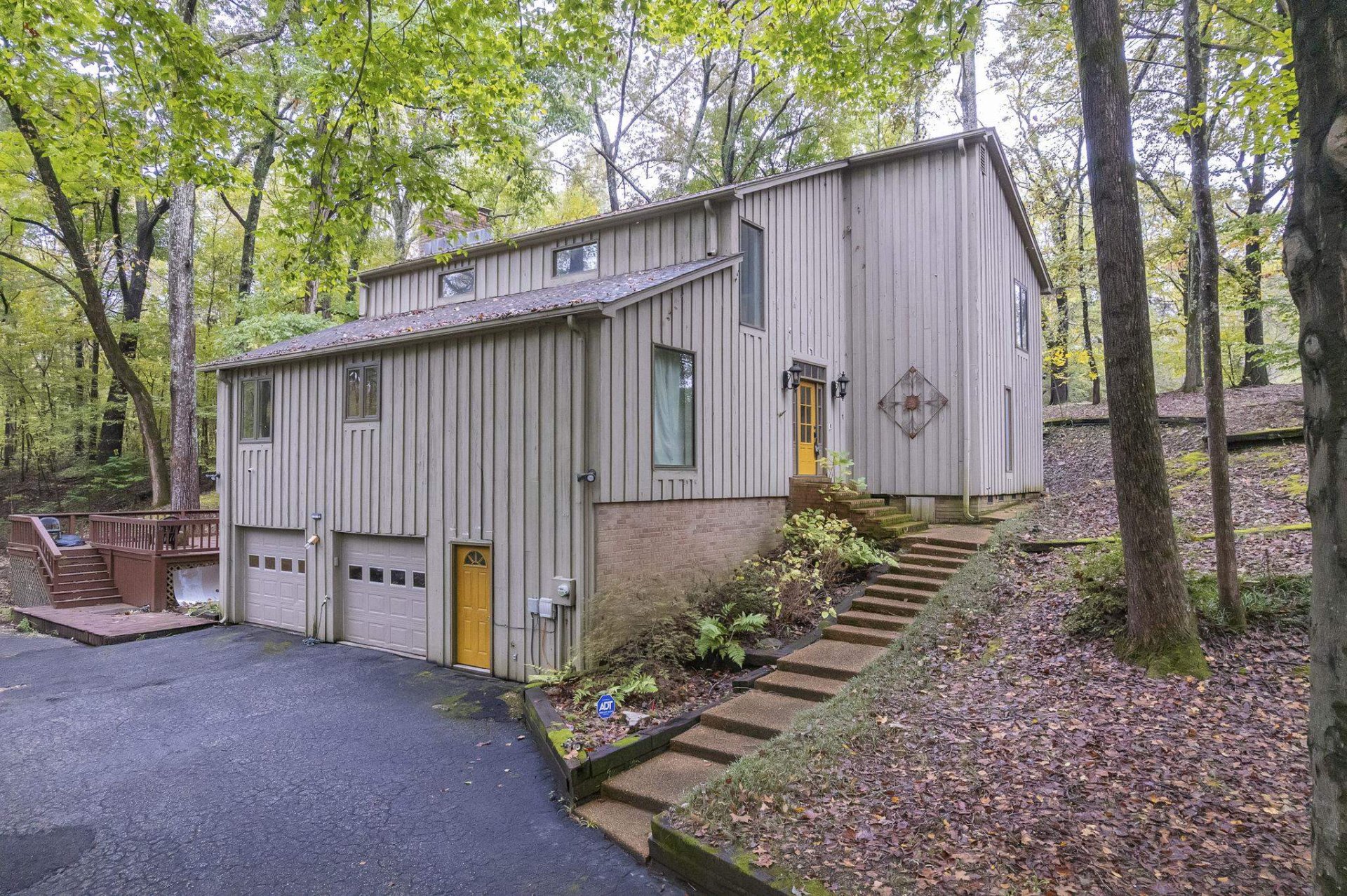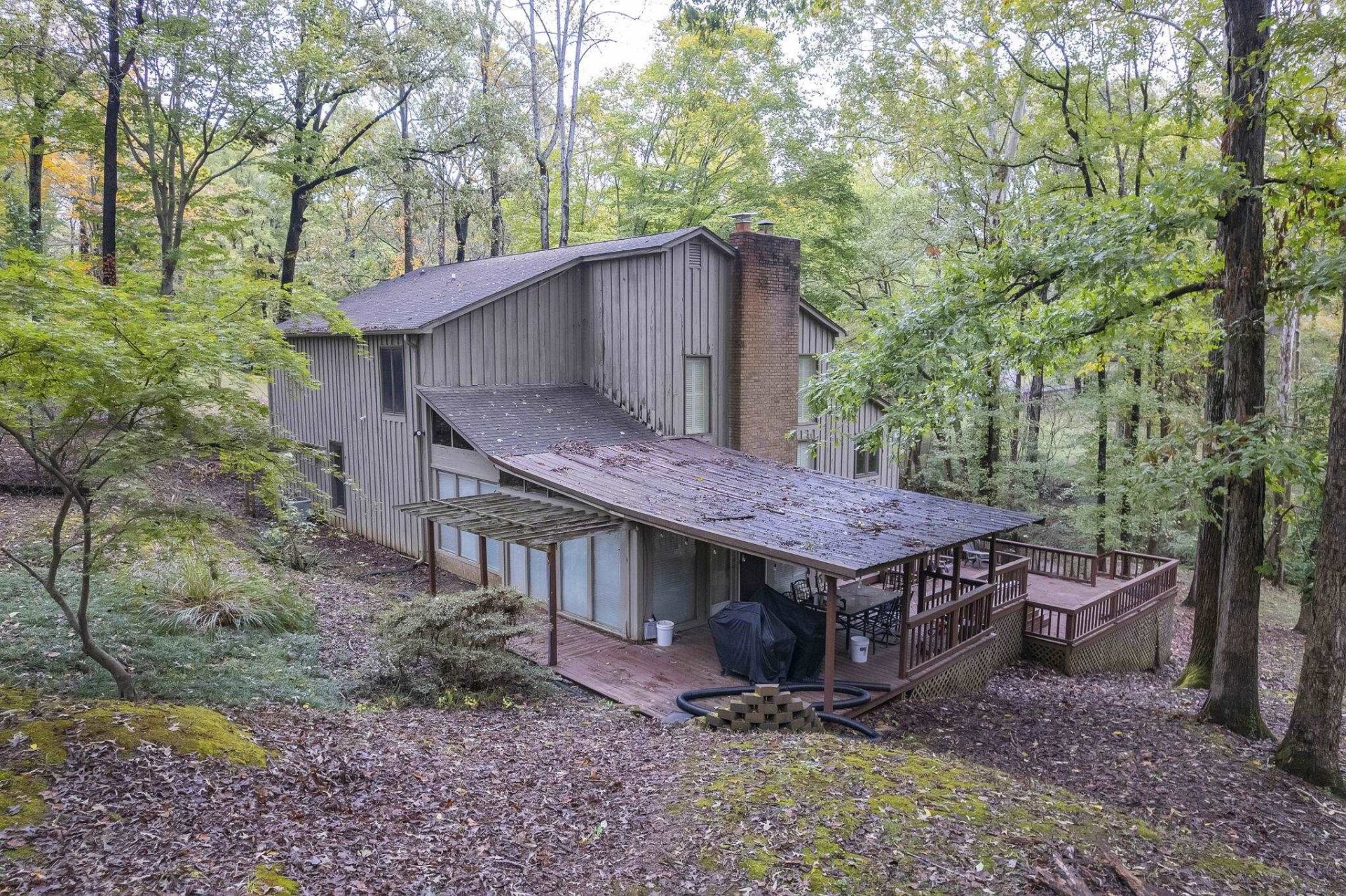 Nestled in a serene, wooded retreat, this mid-century contemporary gem blends timeless design with natural seclusion. Soaring beamed ceilings crown the expansive great room, complemented by custom built-in shelving and a dramatic floor-to-ceiling brick fireplace. The efficient kitchen boasts generous counter space and abundant storage for seamless functionality. Brick flooring adds rustic charm to the cozy den and elegant sun room. Retreat to the spacious primary suite for ultimate restoration. Outside, multi-tiered decks extend the living space, inviting you to unwind amid the tranquil backyard oasis.