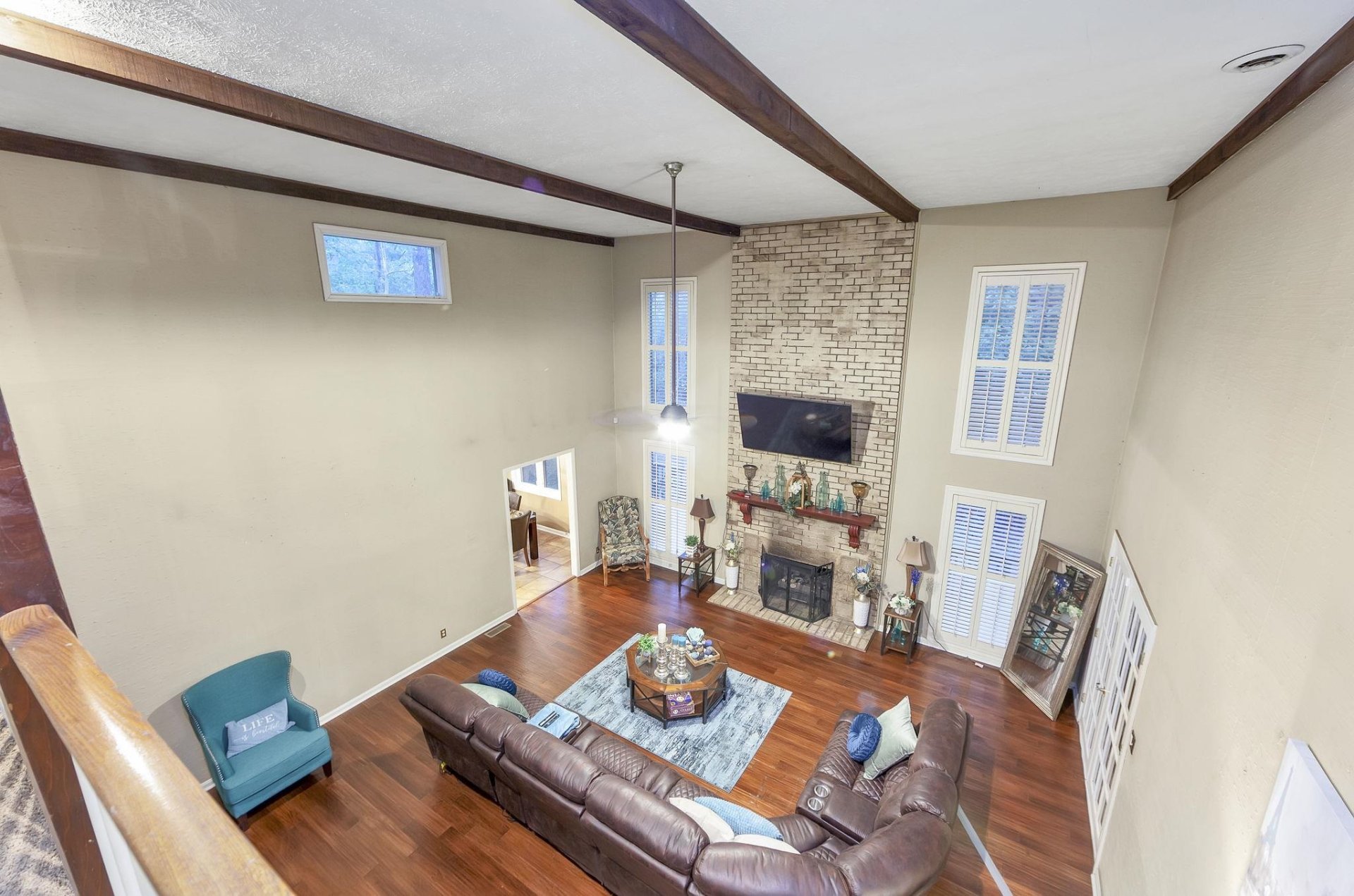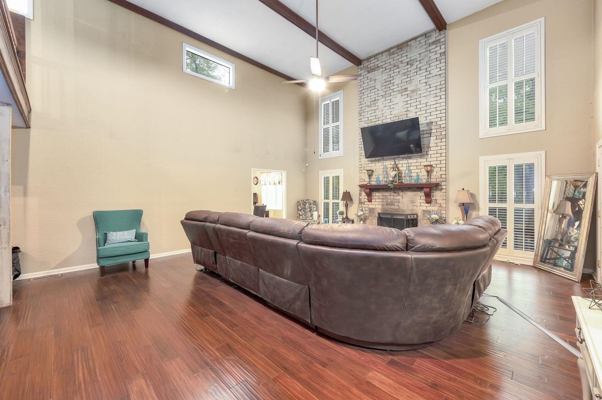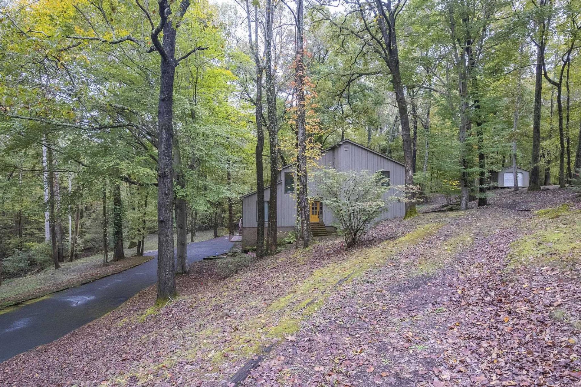Nestled in a serene, wooded retreat, this mid-century contemporary gem blends timeless design with natural seclusion. Soaring beamed ceilings crown the expansive great room, complemented by custom built-in shelving and a dramatic floor-to-ceiling brick fireplace. The efficient kitchen boasts generous counter space and abundant storage for seamless functionality. Brick flooring adds rustic charm to the cozy den and elegant sun room. Retreat to the spacious primary suite for ultimate restoration. Outside, multi-tiered decks extend the living space, inviting you to unwind amid the tranquil backyard oasis.