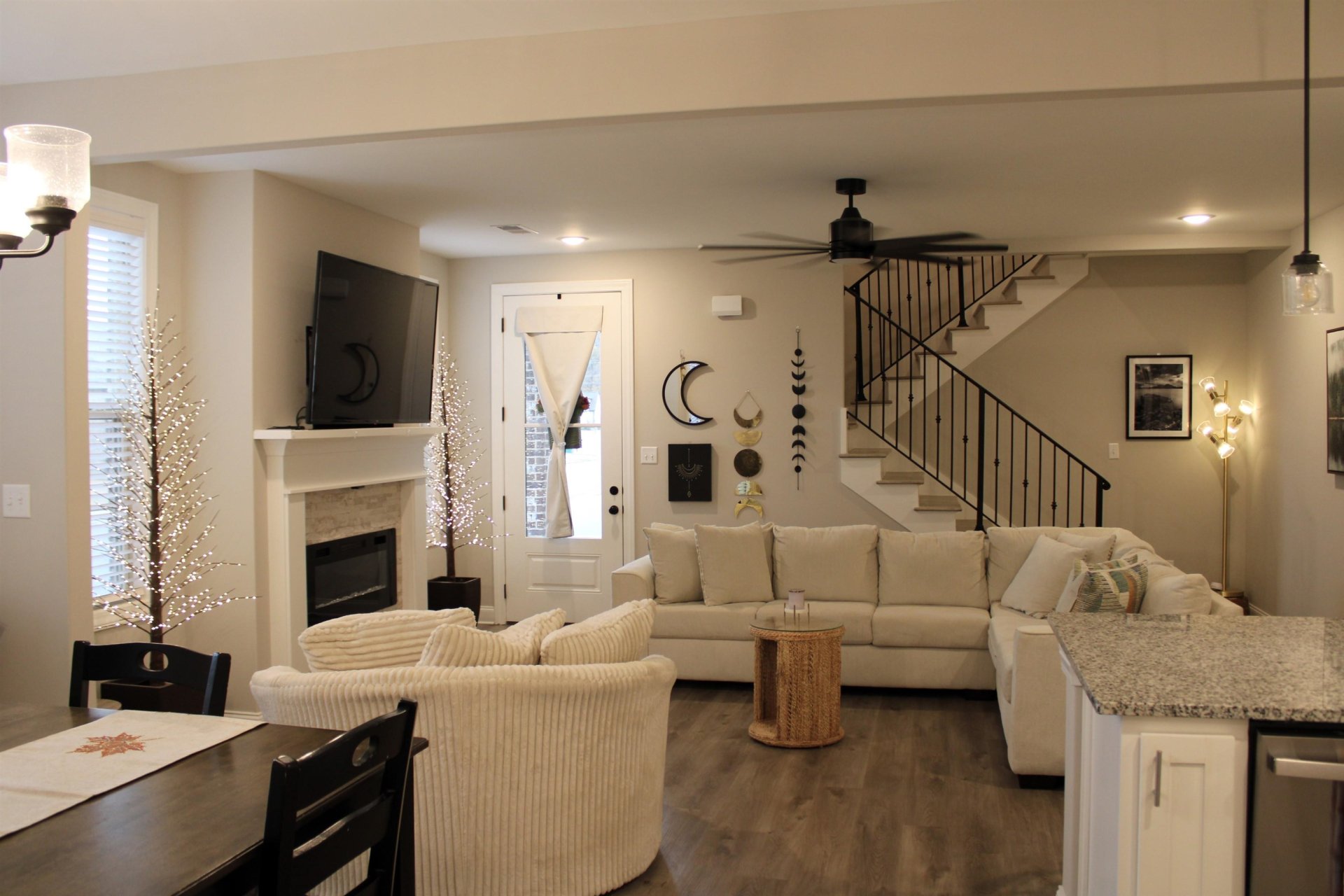 In Woodland Hills SD, this previous model home showcases the popular Spruce Plan with 4BRs or 3BRs plus game room and 2-1/2 BAs. The kitchen impresses with abundant cabinets, granite countertops, snack bar, pantry, and stainless steel appliances with refrigerator to remain. The open floor plan flows into a stunning great room enhanced by a remote-controlled, color-changing glass beads fireplace. The primary bedroom downstairs offers luxurious salon bath with floating tub, oversized walkthrough shower with double heads, and L-shaped double sinks granite top vanity plus walk-in closet. Additional amenities include LVP flooring throughout; tile in baths and laundry room; an extra-large laundry room with second coat closet, cabinets, and built-in bench with coat hooks by garage entry; two-inch blinds; smooth ceilings; 2 HVAC systems; and walk-in attic storage. Exterior highlights include double garage, privacy fenced corner lot, covered patio, and gutters. Truly better than new!