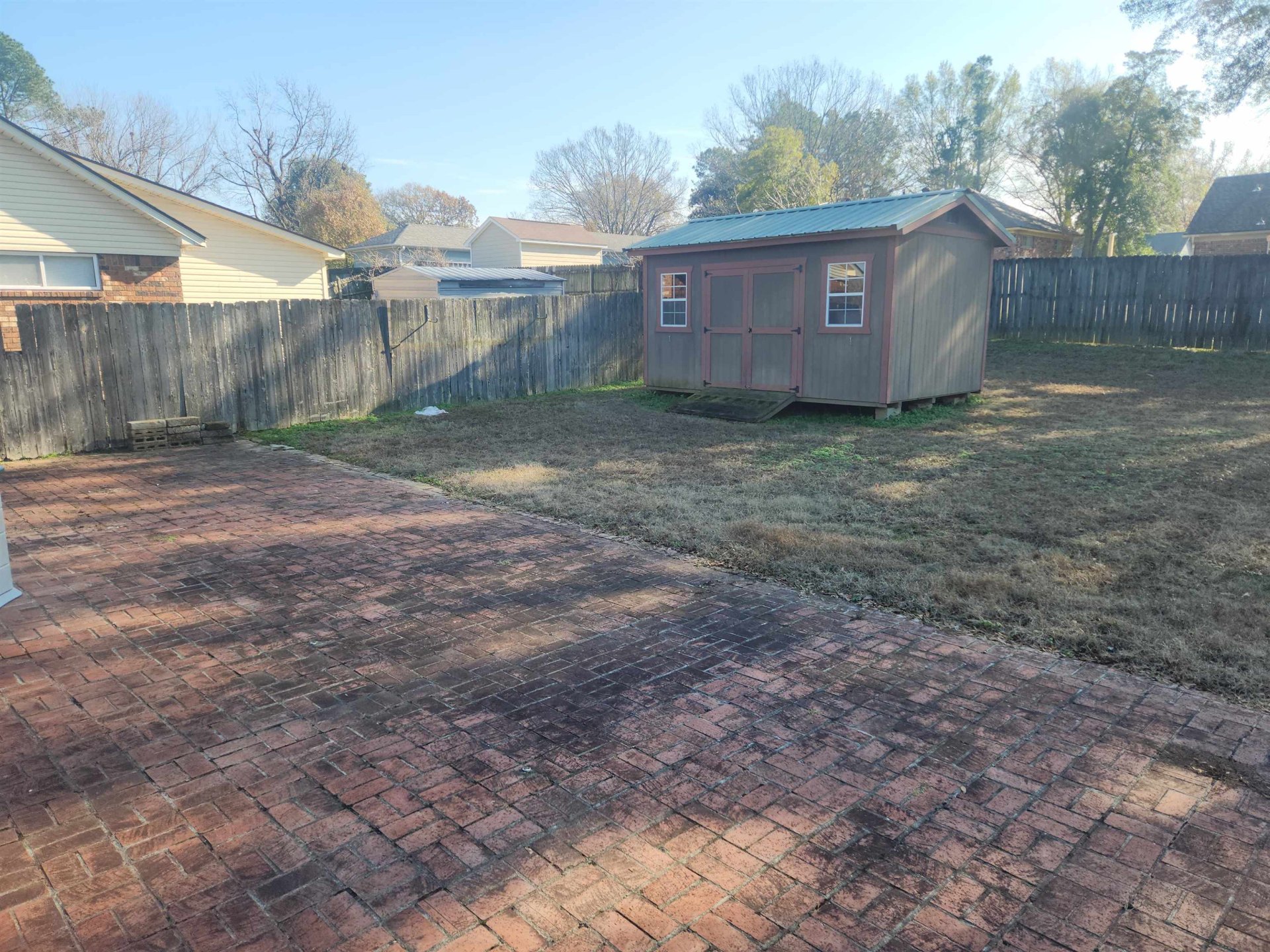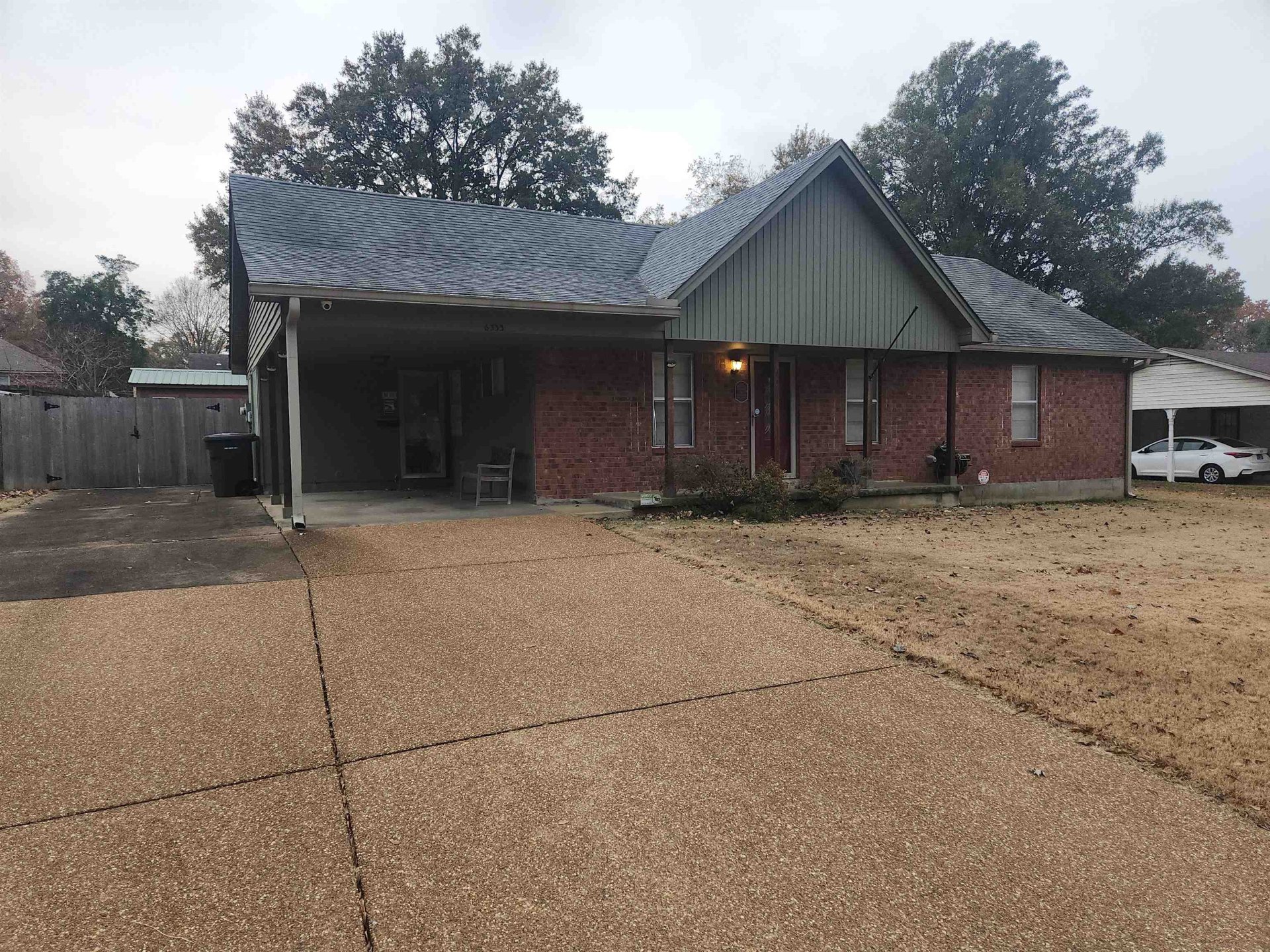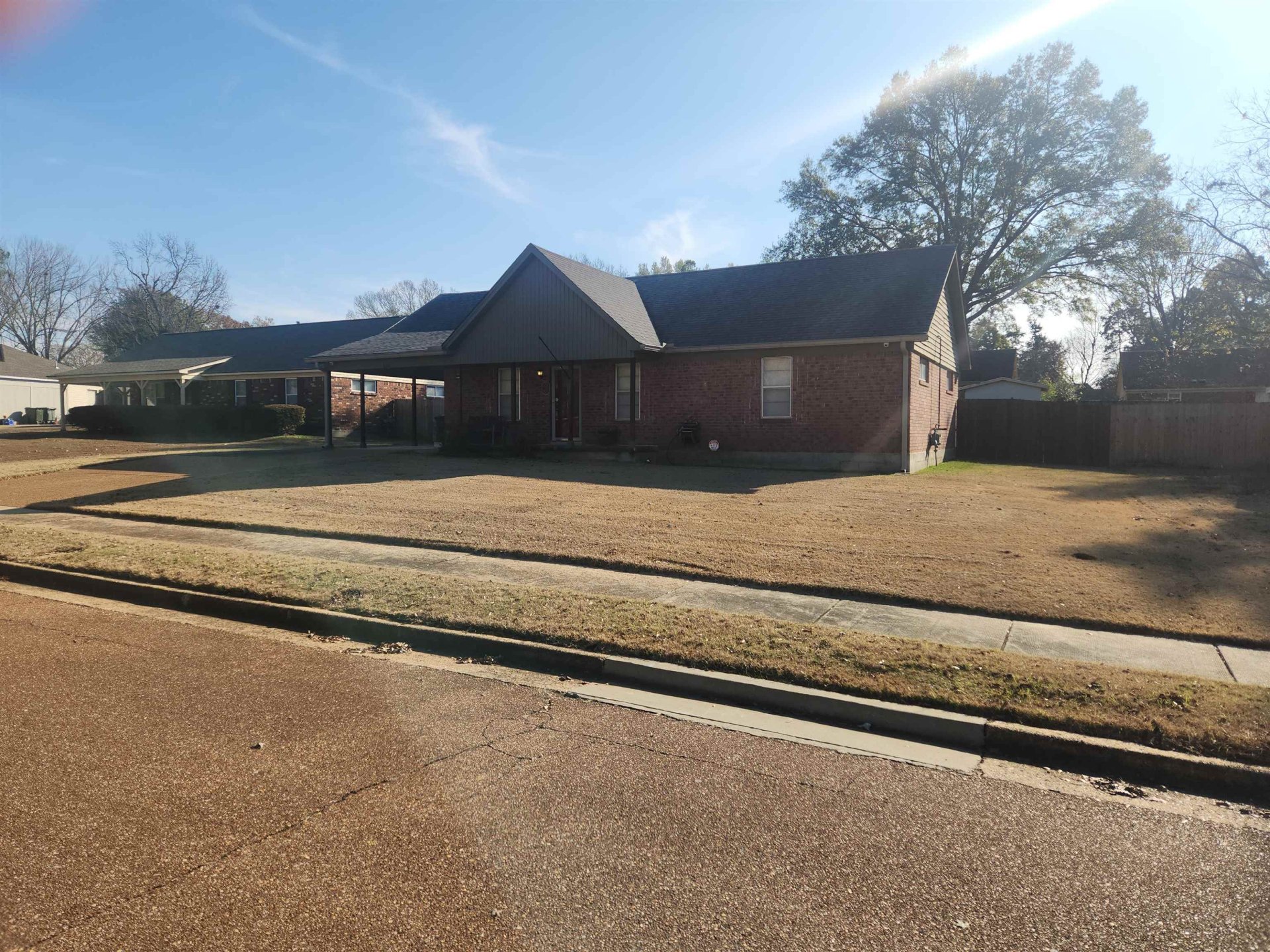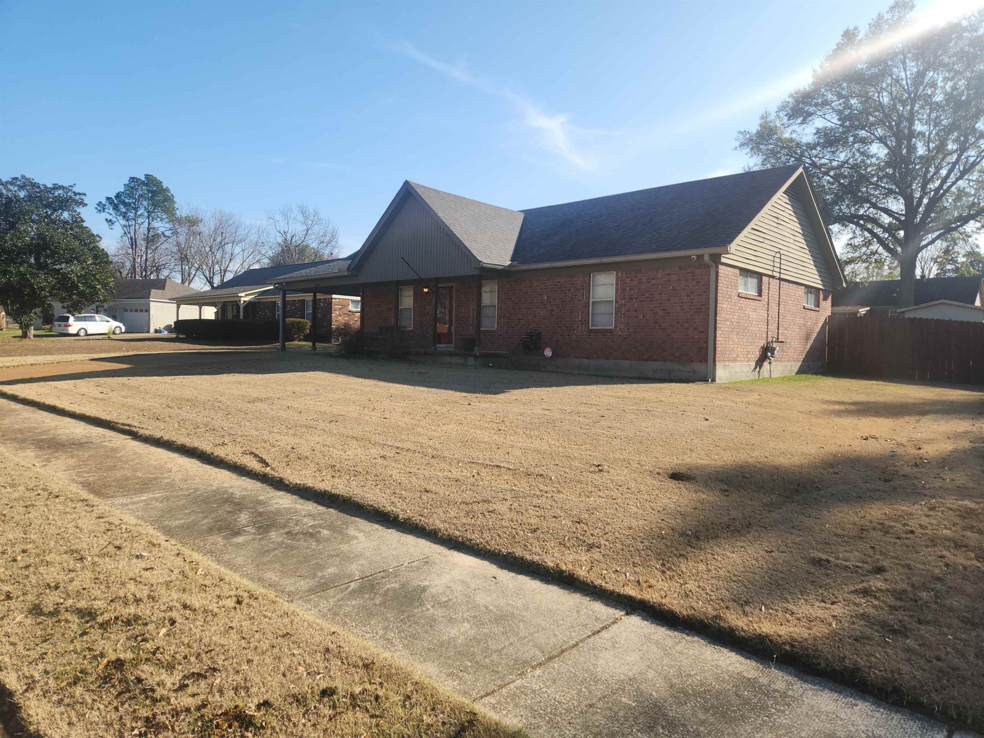 Well built 3BR/1.5BA home with attached carport. Brick exterior. Newer roof, dimensional shingle. Cove lot. Wood laminate flooring in living areas. Carpet in BR's. Living rm, Den with masonry FRPL. Open kitchen with built-in oven, dishwasher, microwave, disposal. Separate laundry room with tankless water heater. Full bath in hallway. Half bath in primary br. Oversized brick patio. Separate shed in backyard. Completely fenced yard. Pull down attic stairs. Front porch. Extra parking pad