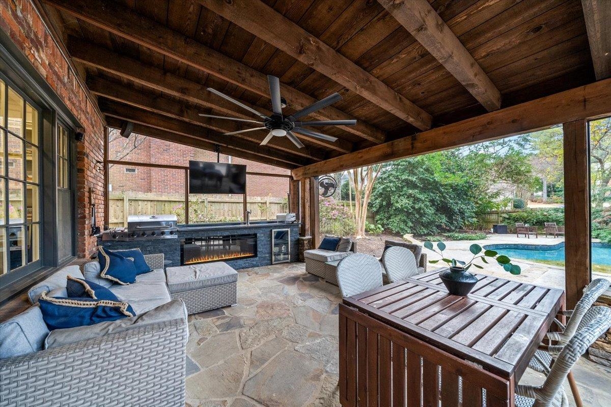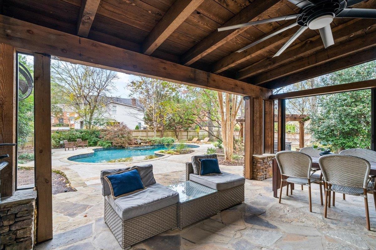 Every room of this home has been thoughtfully refreshed and updated. The fully remodeled kitchen is the heart of the home, featuring a quartzite waterfall island and KitchenAid appliances—ideal for entertaining and everyday living. Step outside to a private backyard oasis with a gunite pool featuring a tiered Arkansas fieldstone cascading waterfall, hot tub under pergola with professional lighting, outdoor speakers, screened-in porch with remote retractable screen (2024), and an outdoor bar with kegerator. Inside, the main level offers 9-ft ceilings, hardwood floors, and recessed lighting. All 3 bathrooms have been remodeled, the staircase upgraded with new wood treads and runner, and upstairs bedrooms all feature walk-in closets. Additional living space includes a media room (or br) and third-story bonus/br. Major updates include a new roof (2024), pool pump (2024), and water heater (2025). Irrigation syst., custom garage built-ins, w/ additional tool room. Walk to Riverdale k-8!!!