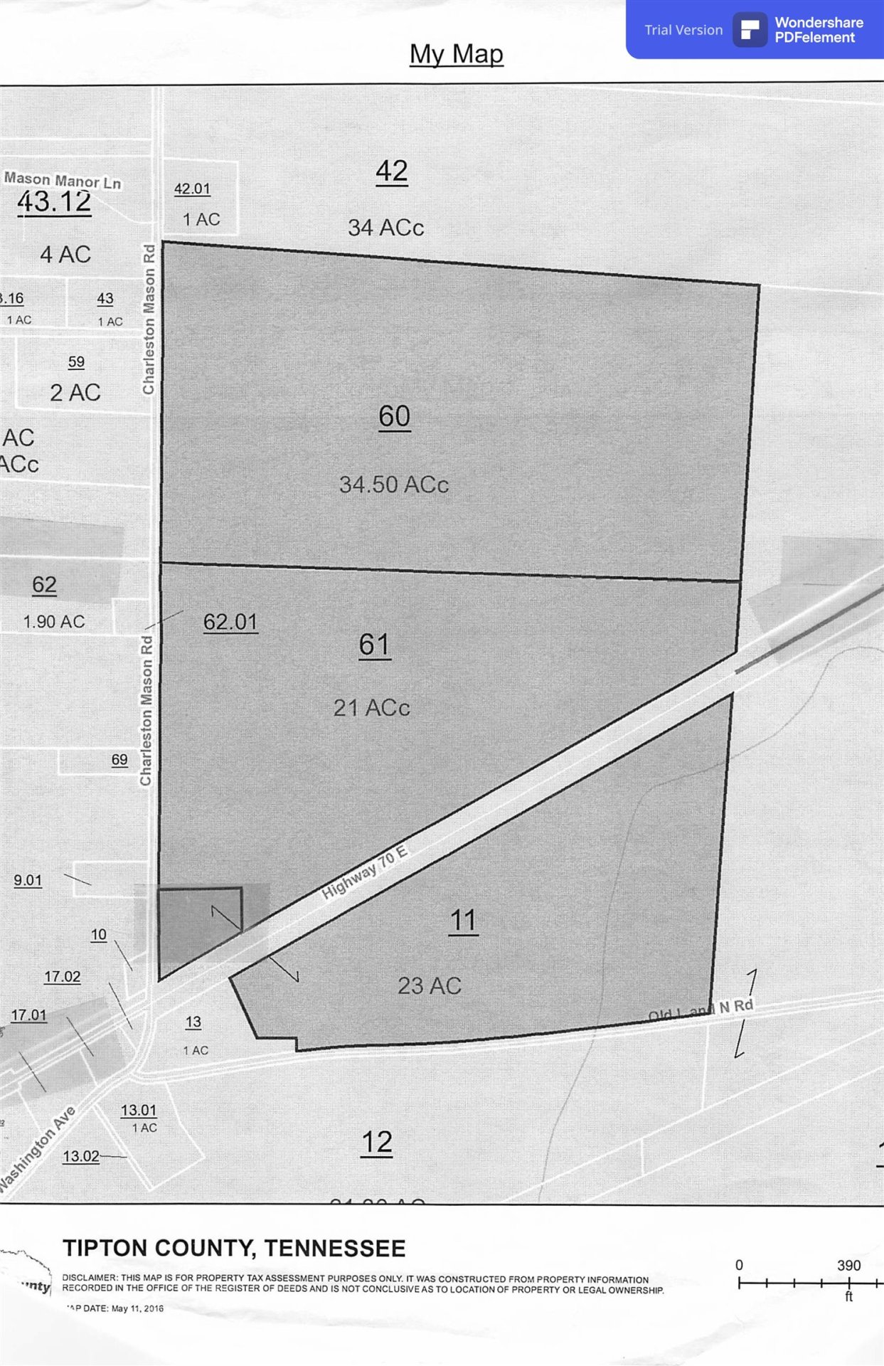 Sale comprises 3 parcels of property, lots 60, 61, and 11 as shown on the attached plat for a total of 78.5 acres, more or less. Lot 11 is zoned C-1, and lots 60 and 61 are zoned FAR. 48 Acres, more or less, are leased for farming and in row crops through the end of the year, but the lease can be bought out. Property being sold for development. Five miles from Ford Tennessee Truck Plant. Railroad access nearby. GIS maps not accurate. 16 acres south of Hwy 70, 62.5 acres on the north side.