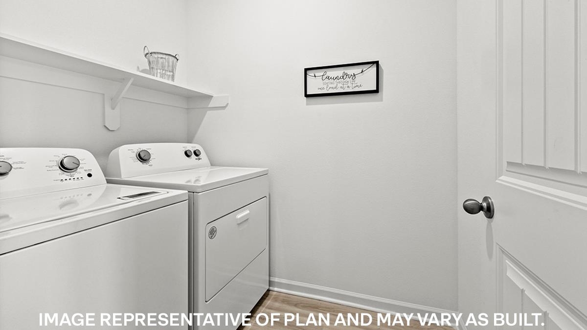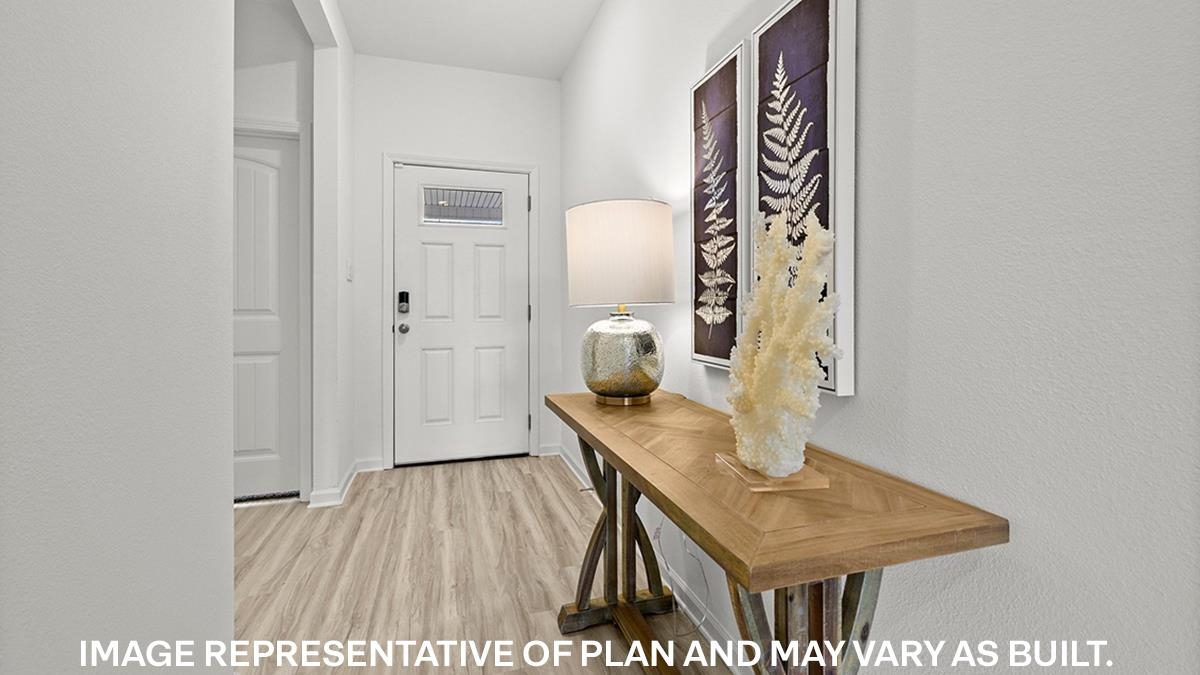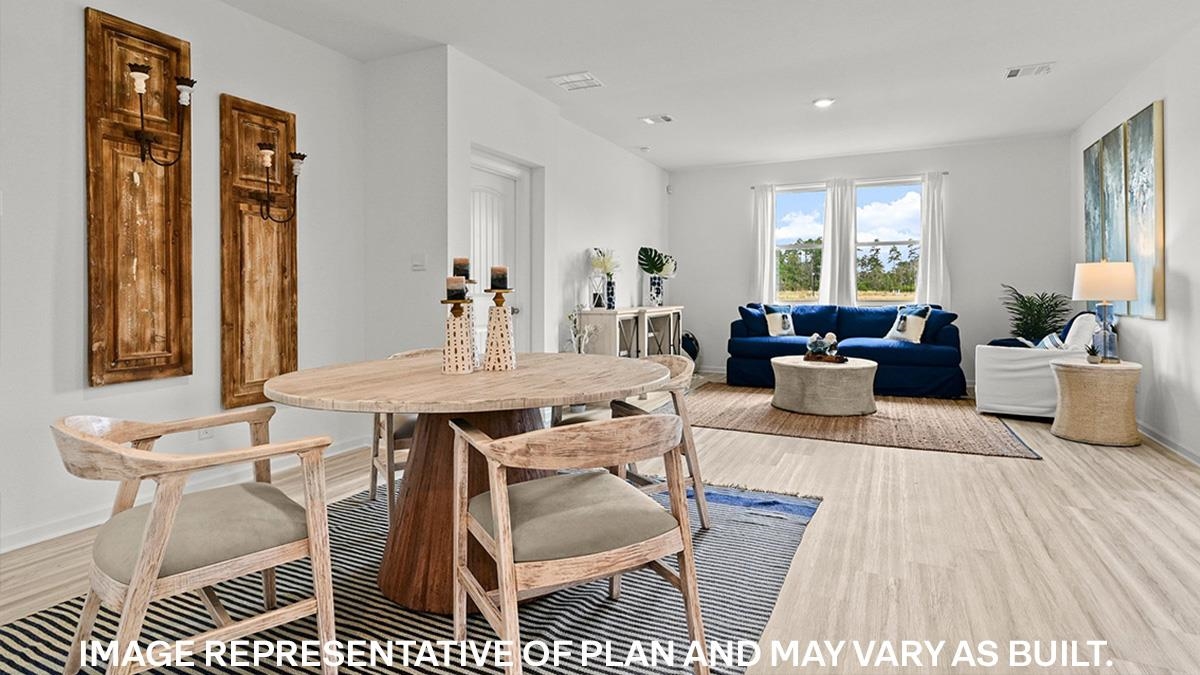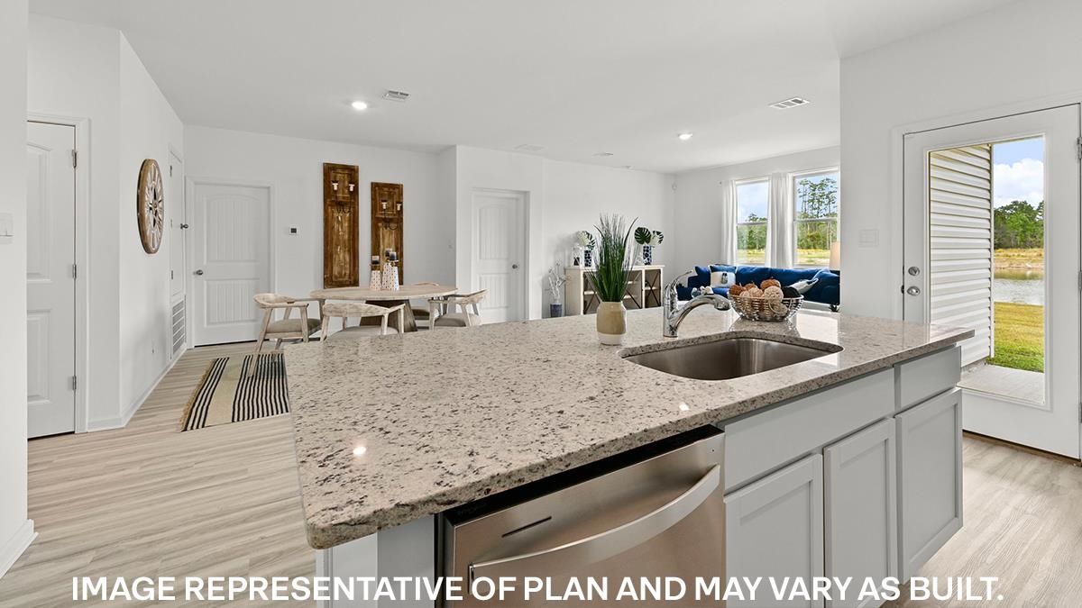 The appealing one-story home includes many contemporary features. An open-concept design including 9’ ceilings enhance the wonderful feel of this home. The kitchen includes a large counter perfect for bar-style eating or entertaining, a spacious pantry and plenty of cabinets and counter space. The large living room overlooks the patio, which is a great area for relaxing and dining al fresco. Bedroom One, located at the back of the home for privacy, can comfortably fit a nice size bed, and includes an en suite bathroom with a vanity and big walk-in closet. Two other bedrooms share a second bathroom. The two-car garage connects to a small hallway where the laundry room is located. Must See! Beautiful, all new phase - Village Park - Special Below Market Rate through DHI Mortgage. Photos are of decorated model while under construction. Move-in package includes blinds on all windows, Smart Home package, Microwave, Dishwasher, and Refrigerator!