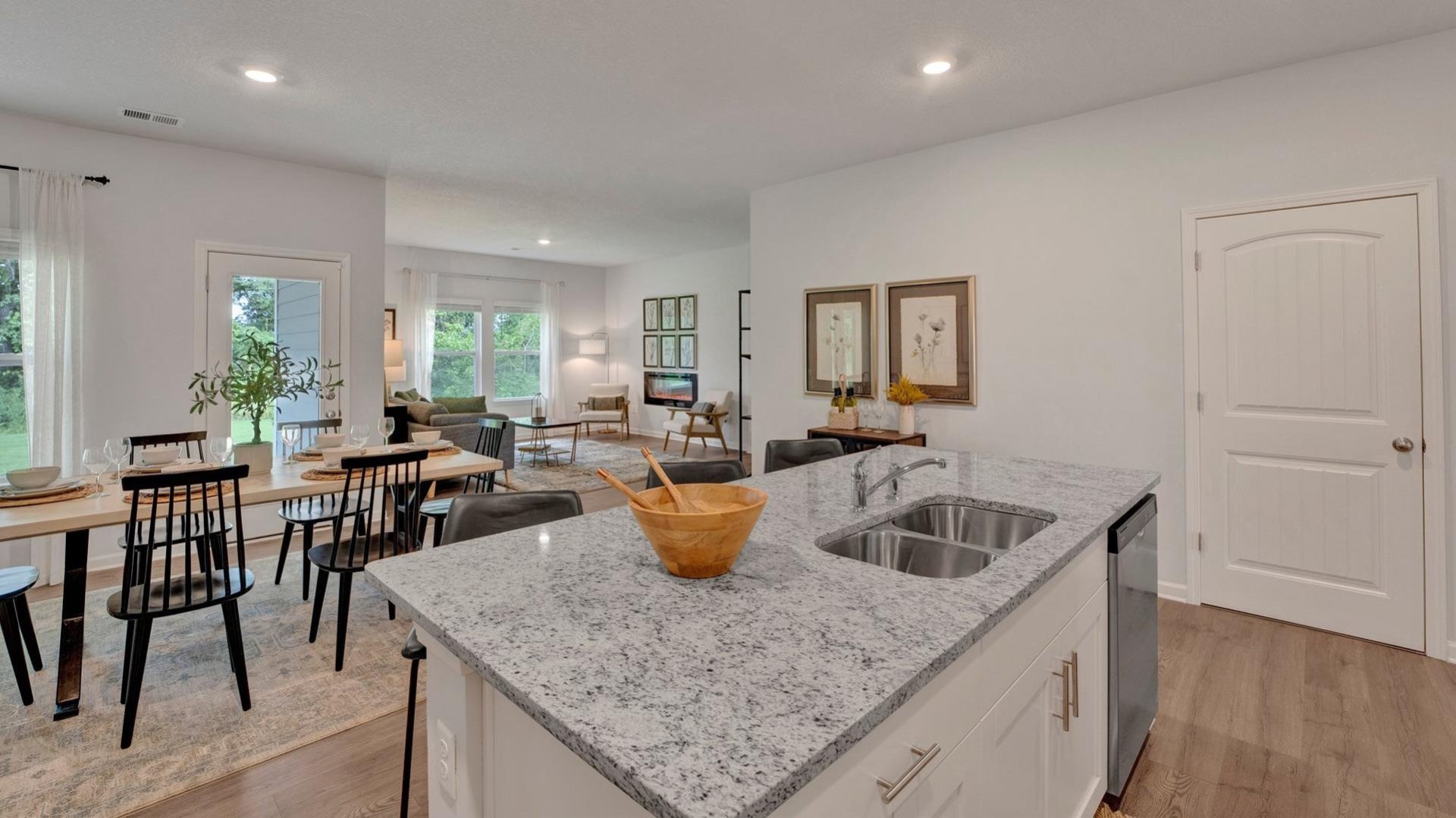 The appealing one-story home includes many contemporary features, and an open-concept design and 9’ ceilings enhance the wonderful feel of this home. The kitchen includes a large island perfect for bar-style eating or entertaining, a walk-in pantry, and plenty of cabinets and counter space. The dining room and living room both overlook the covered porch, which is a great area for relaxing and dining al fresco. The large Bedroom One, located at the back of the home for privacy, can comfortably fit a king size bed, and includes an en suite bathroom with double vanity, big walk-in closet, and separate linen closet. Three other bedrooms share a second bathroom. The two-car garage connects to the front hallway where the laundry room and an extra storage closet are also located. Pictures, photographs, colors, features, and sizes are for illustration purposes only and will vary from the homes as built.