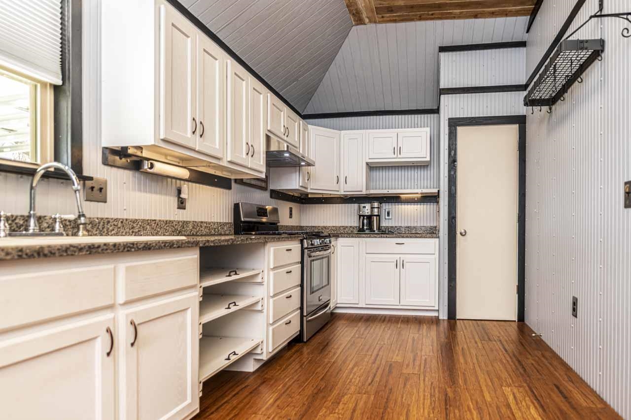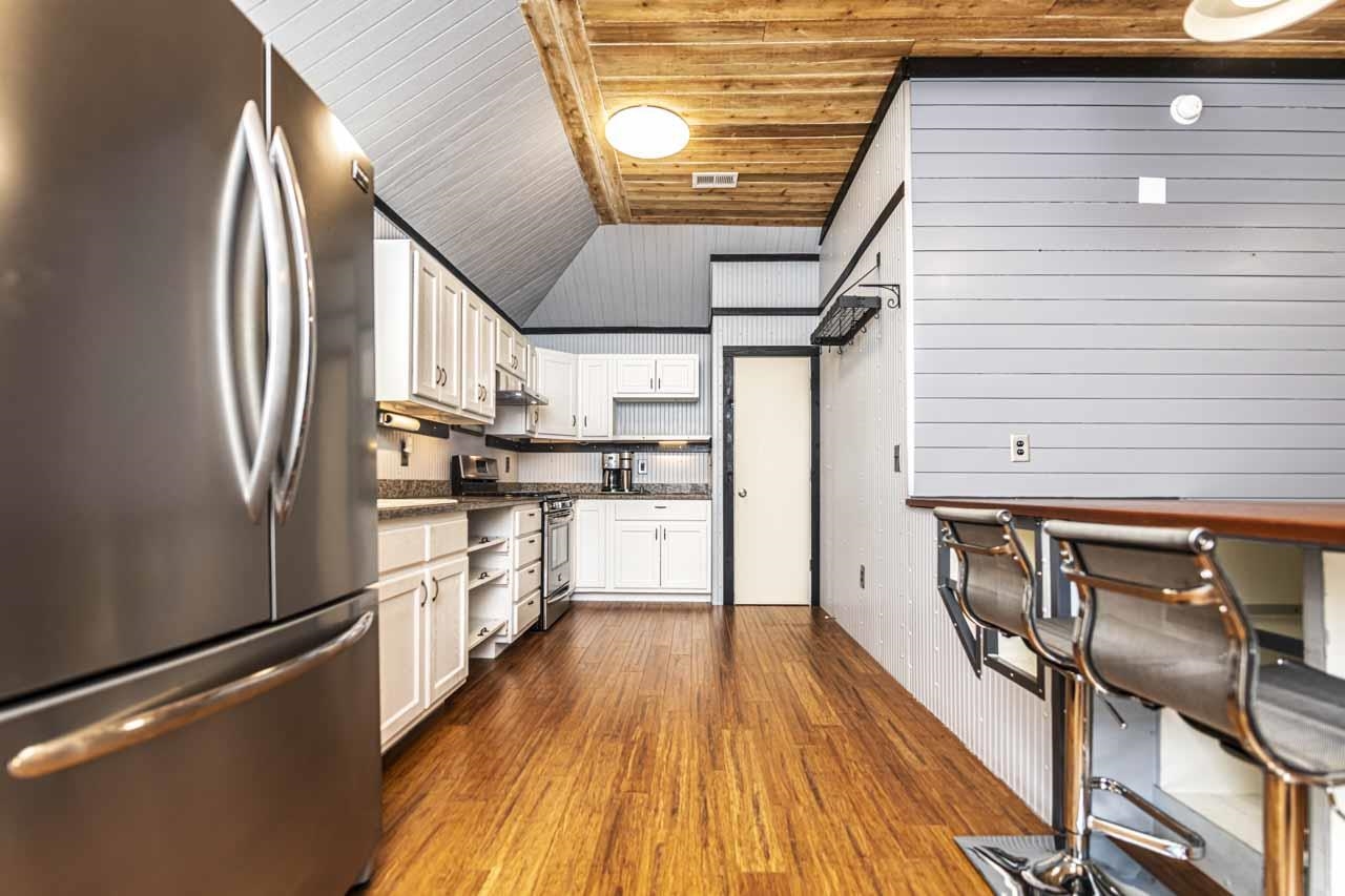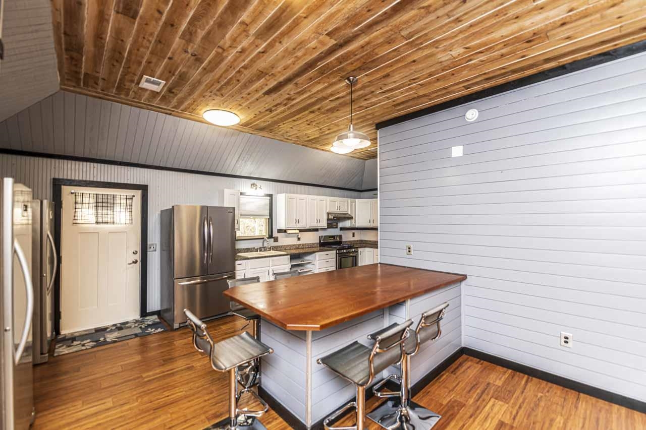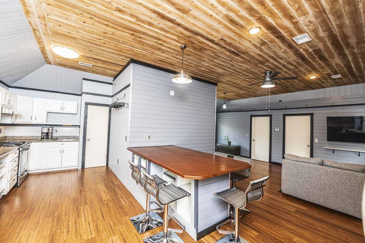 One-of-a-kind modern home with incredible walk out basement garage, shop & storage areas. This 2BR, 1.5BA home offers a rustic-modern interior featuring wood ceilings, metal accents, shiplap walls, & an open living/kitchen area full of character. The primary bath includes large walk-in closet & shower. Modern finishes give this home a bold masculine feel that is truly unique. The walk out basement is where this property truly shines, featuring a massive 2-car garage PLUS a motorcycle/ATV garage, three separate storage areas, & ample workspace. The walk out basement garage & storage areas make this ideal for hobbyists, small business owners, mechanics, woodworkers, or anyone needing serious workspace. Additional covered parking includes a 1-car carport on the main level & a large 2-car carport below. Distinctive property with unmatched garage/workspace potential. 2.84 acres backs up to railroad & park for added privacy, no rear neighbors. Built like a bunker & designed with purpose.
