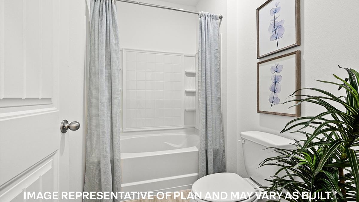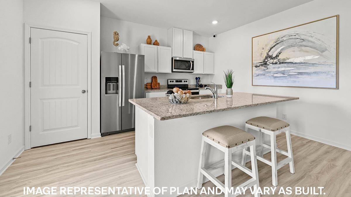 The appealing one-story home includes many contemporary features. An open-concept design including 9’ ceilings enhance the wonderful feel of this home. The kitchen includes a large counter perfect for bar-style eating or entertaining, a spacious pantry and plenty of cabinets and counter space. The large living room overlooks the patio, which is a great area for relaxing and dining al fresco. Bedroom One, located at the back of the home for privacy, can comfortably fit a nice size bed, and includes an en suite bathroom with a vanity and big walk-in closet. Two other bedrooms share a second bathroom. The two-car garage connects to a small hallway where the laundry room is located. Must See! Beautiful, all new phase - Village Park - Special Below Market Rate through DHI Mortgage. Photos are of decorated model while under construction. Move-in package includes blinds on all windows, Smart Home package, Microwave, Dishwasher, and Refrigerator!