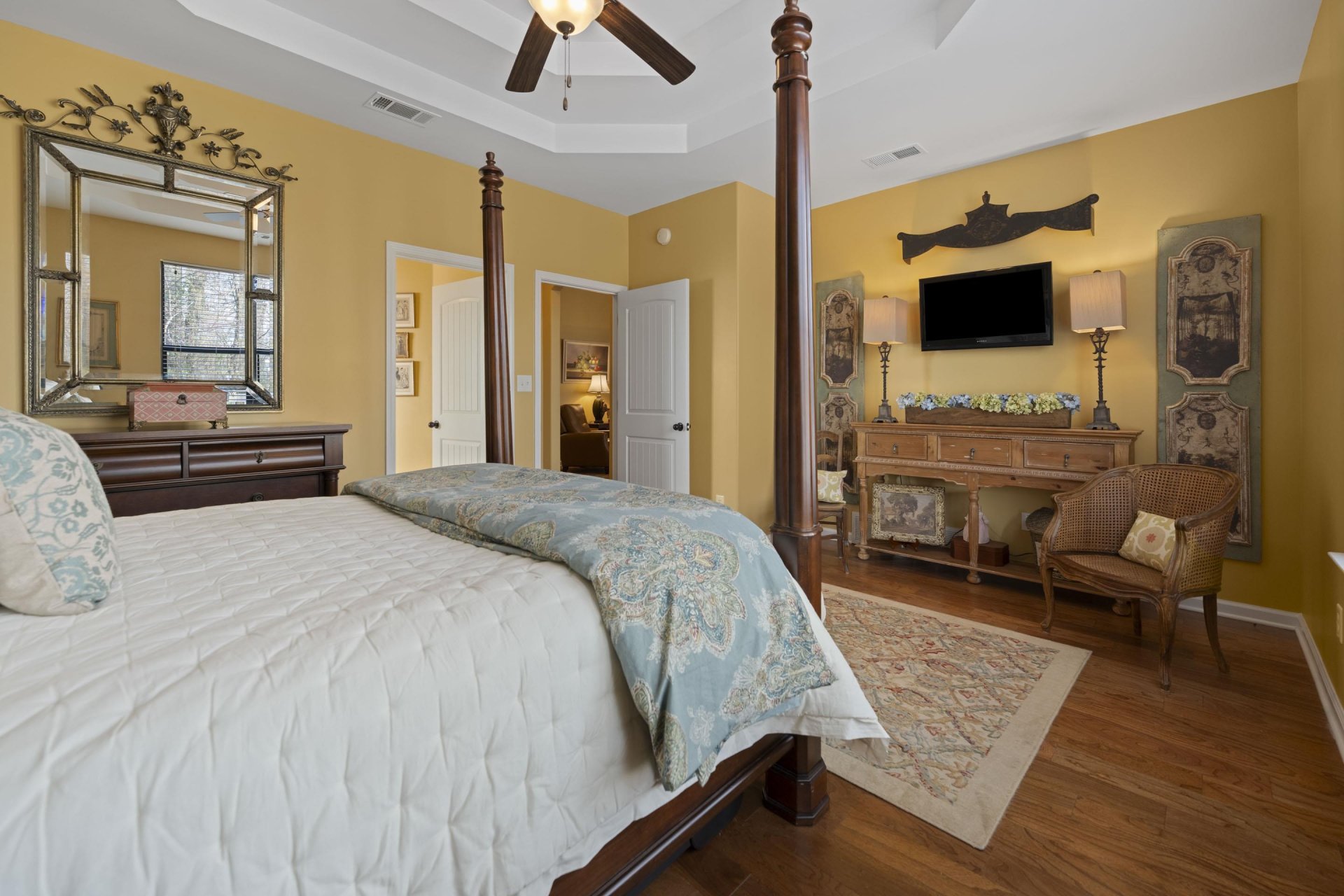 | Flooring | Hardwood Throughout, Wall to Wall Carpet, Tile, Smooth Ceiling, 9 or more Ft. Ceiling, Vaulted/Coff/Tray Ceiling |