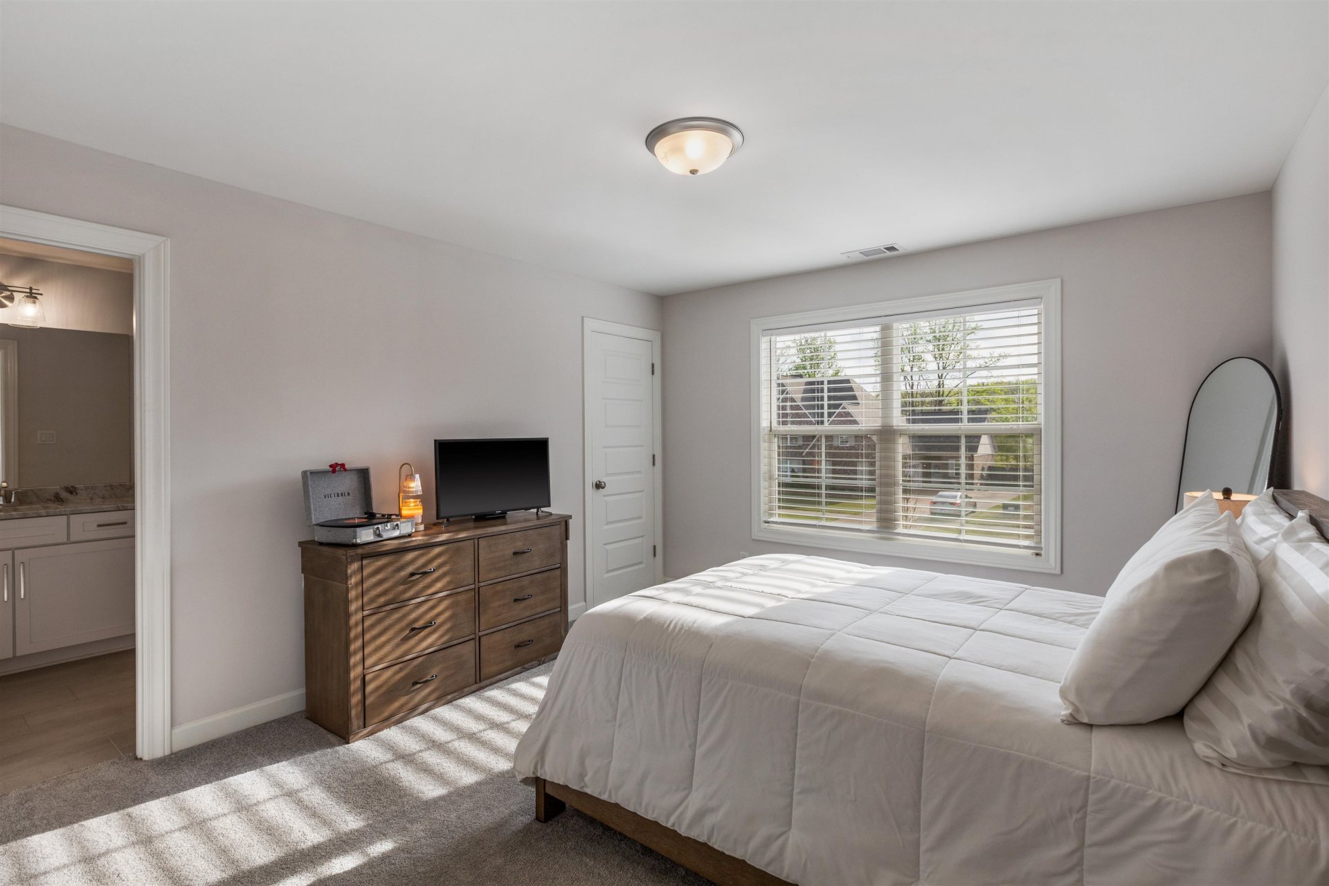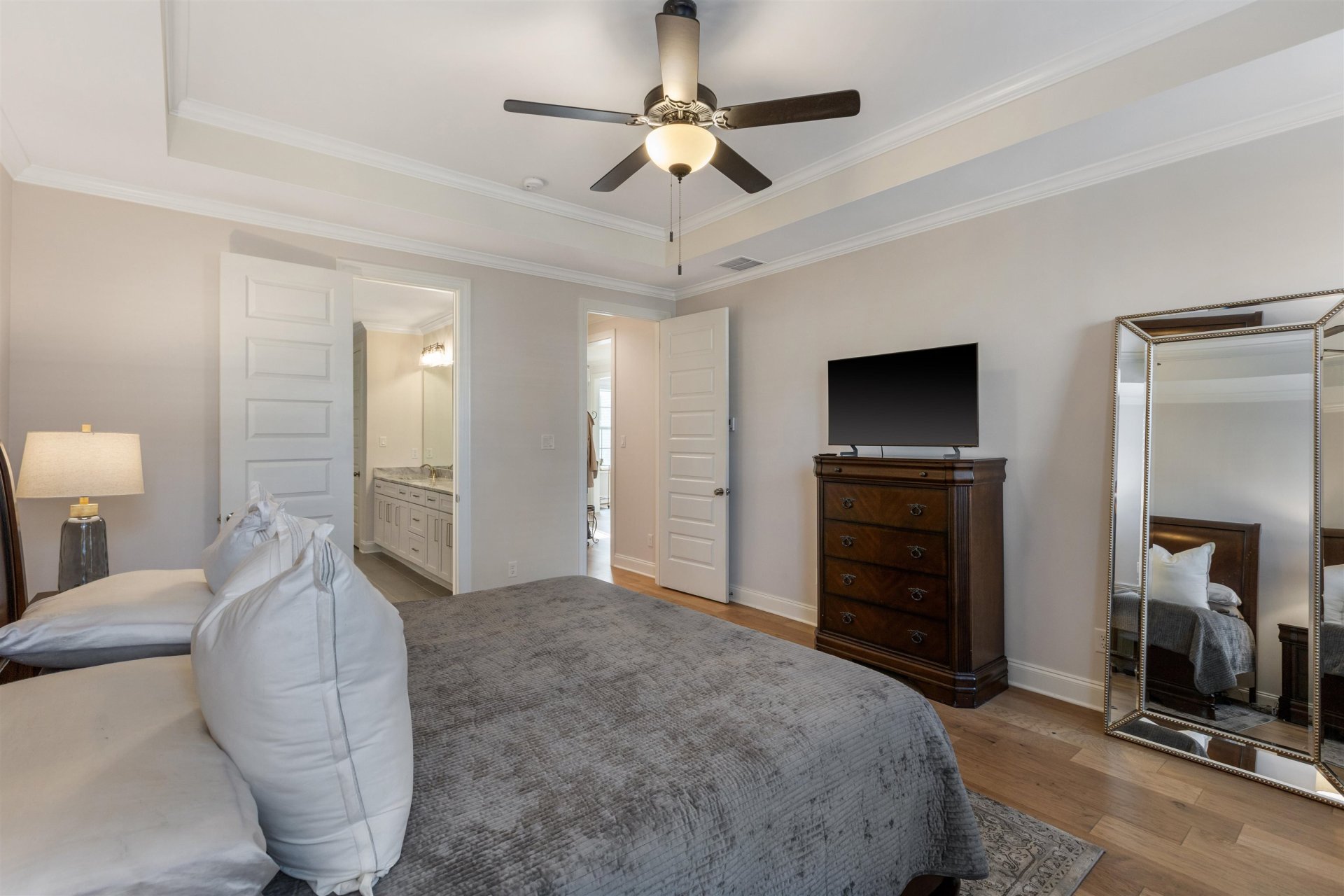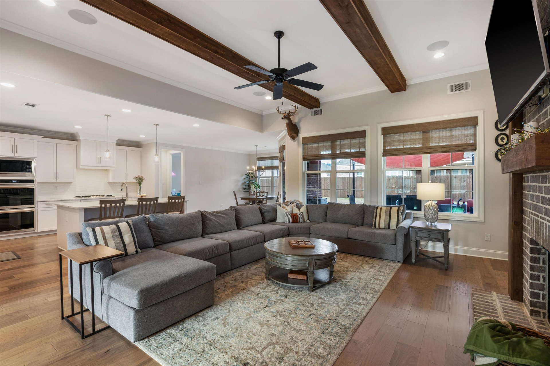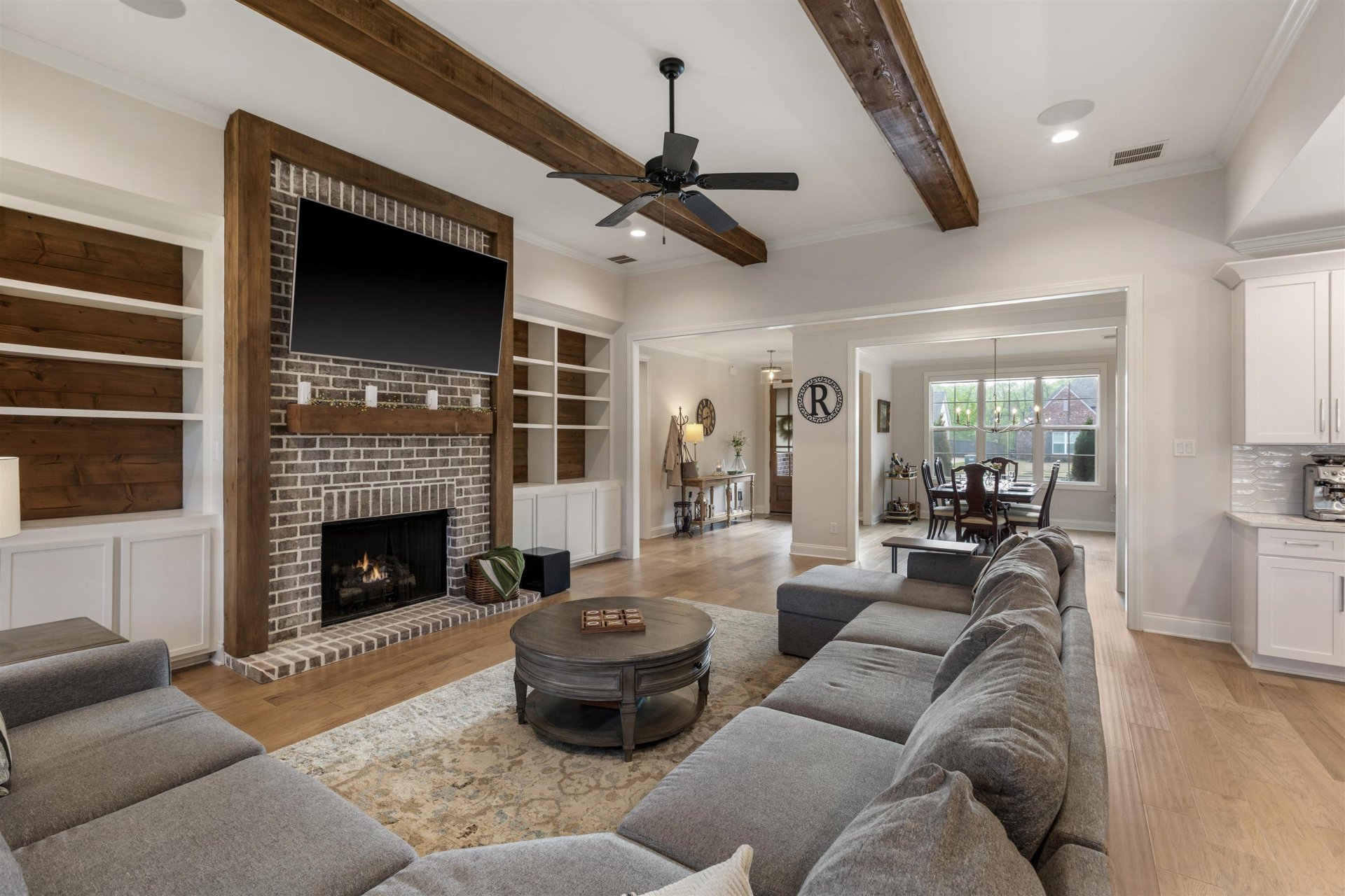 Welcome to this stunning 2023-built home in Oakwood Grove, where elevated comfort meets refined luxury. Showcasing thoughtful design throughout, this 4BD/4.5BA home offers spacious living on a beautifully maintained lot. Inside, the open floor plan features a breathtaking great room with cedar beams, built-ins & a brick fireplace, flowing seamlessly into a chef’s kitchen with quartz counters, gas cooking, double convection ovens, island seating & abundant storage. The split floor plan offers a private primary suite with spa-like bath, while a guest suite sits opposite. Upstairs, enjoy 2 additional bedrooms with en-suite baths + a bonus & adjoining media room pre-wired for surround sound. Designed for entertaining, the extended patio with gas line, outdoor sound & fenced backyard create the perfect setting. Additional highlights include a 3-car garage, Cat5 wiring, fiber optic access & security system w/cameras. Enjoy quality, space, and modern luxury all convenient to Lakeland schools!