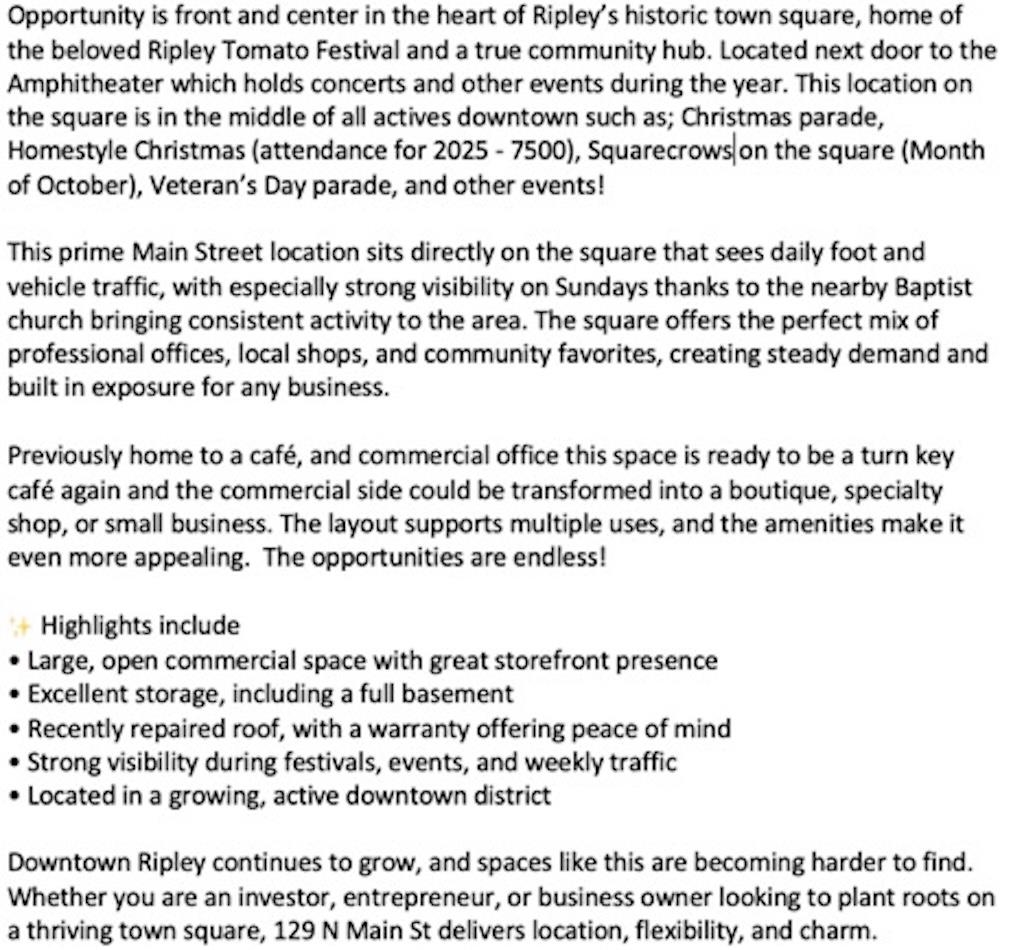 Wonderful turn-key business opportunity on the historic downtown Square of Ripley. Located next to the Amphitheater and just across from the Courthouse. You are purchasing two store fronts- the first is a turn key coffee shop/cafe that is set up and ready to earn money as soon as you sign papers! The second is an income producing, long-term tenant with an established business. The cafe comes with everything you need to start your own coffee shop/cafe/catering service, sandwich shop... the possibilities are up to YOU!! Give us a call today to take a look. See photos for a description of all that this business has to offer!