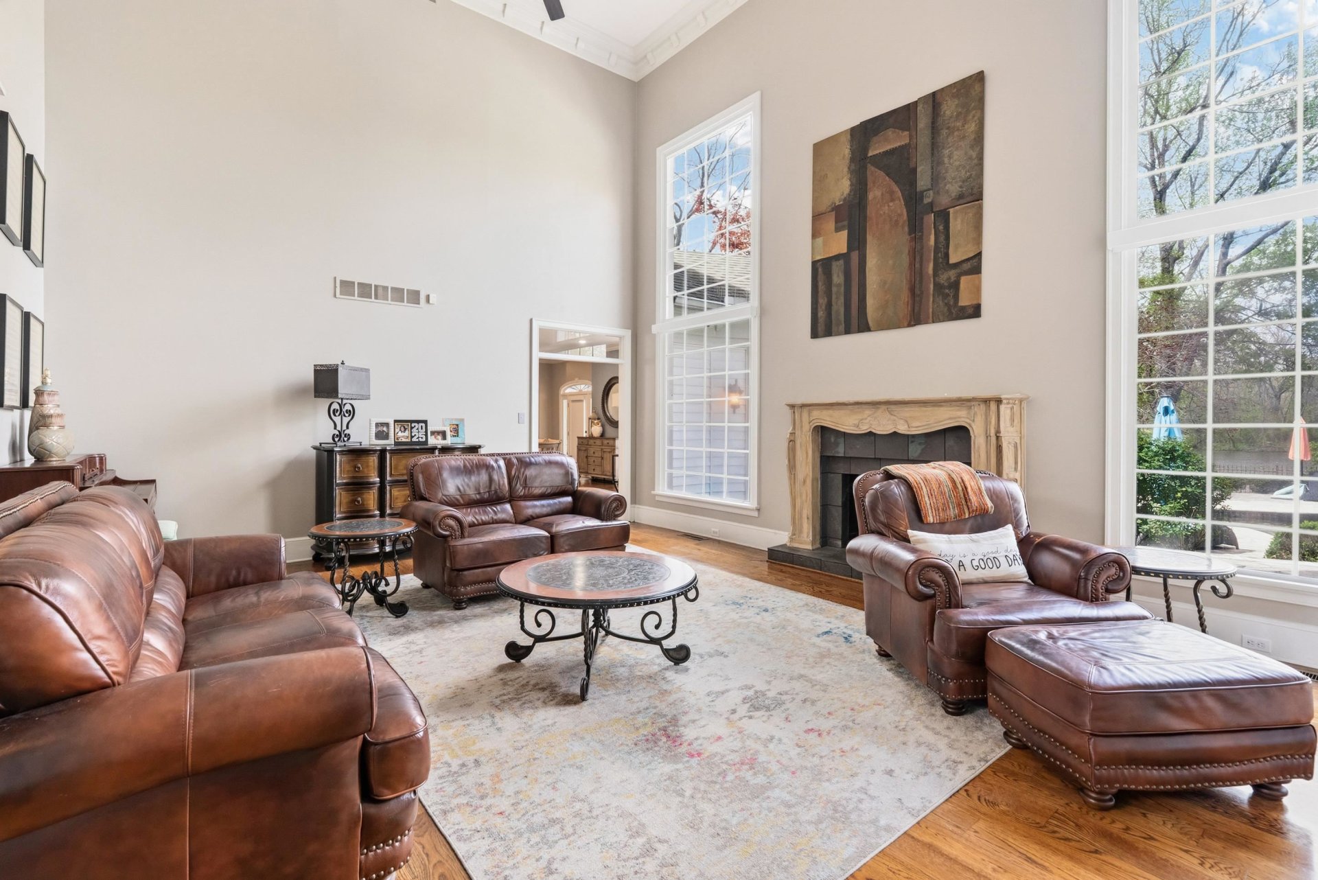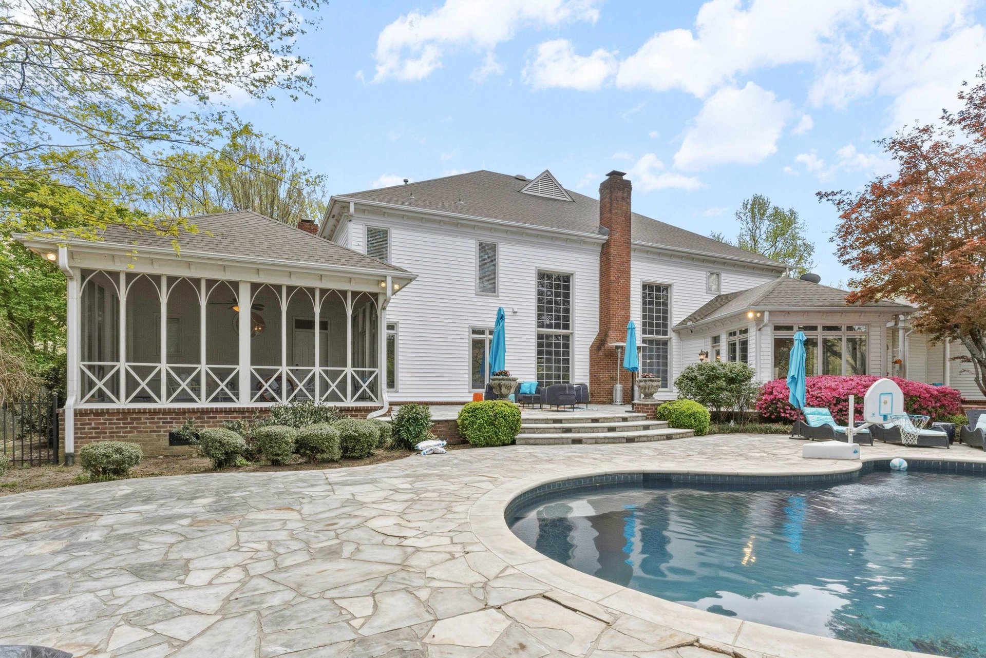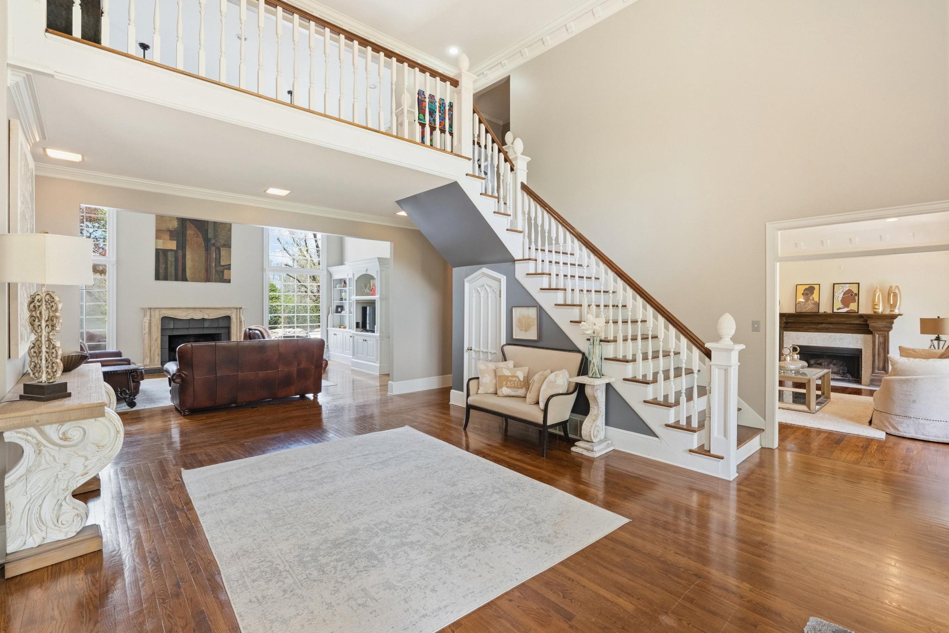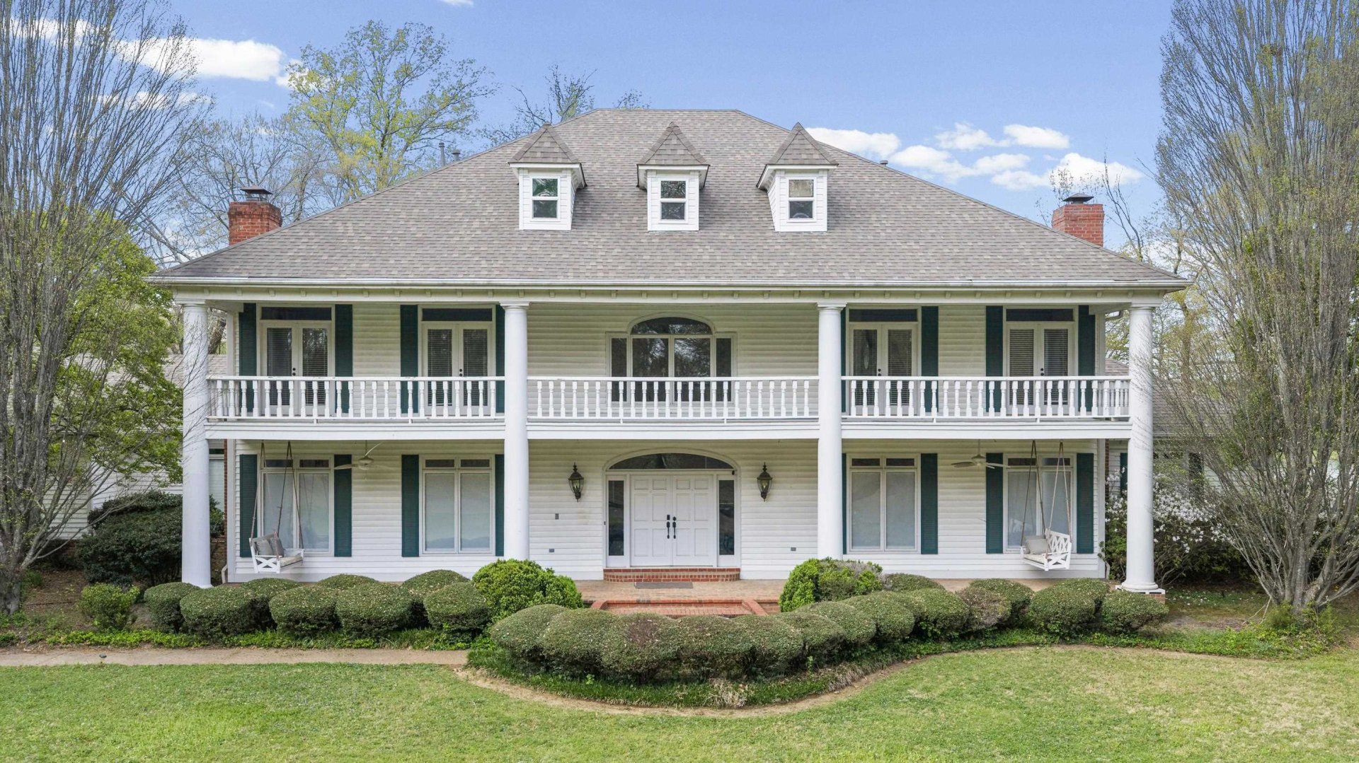 Southern charm and timeless luxury come together in this breathtaking lakefront estate set on a stunning 12-acre lake. A grand foyer makes a striking first impression, with a dramatic balcony overlooking both the foyer and expansive family room. The gourmet kitchen is designed for both everyday living and entertaining, featuring a large island with gas cooktop, double ovens, granite countertops, pantry, and a sunlit glass sitting area. Elegant dining room with fireplace, spacious family room with fireplace and built-in bookshelves, and richly appointed living spaces throughout. All four bedrooms offer private en suites. The luxurious primary suite includes a sitting room, spa-like bath, and oversized walk-in closet. Also featuring an office, upstairs study, and third-floor game room with bar. Outdoors, enjoy a resort-style gunite pool with waterfall, screened porch, and sweeping lake views.