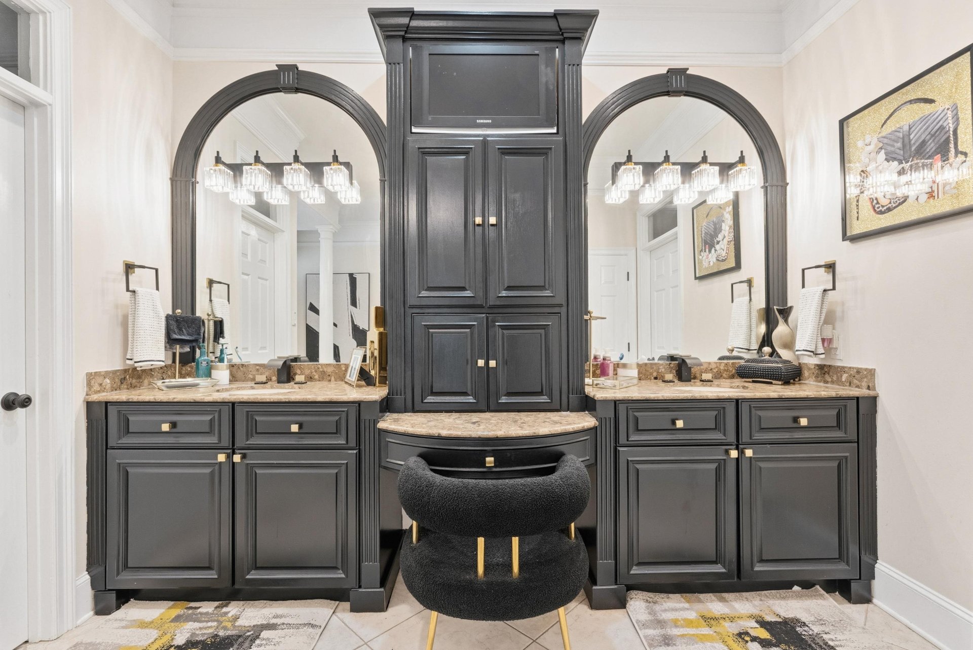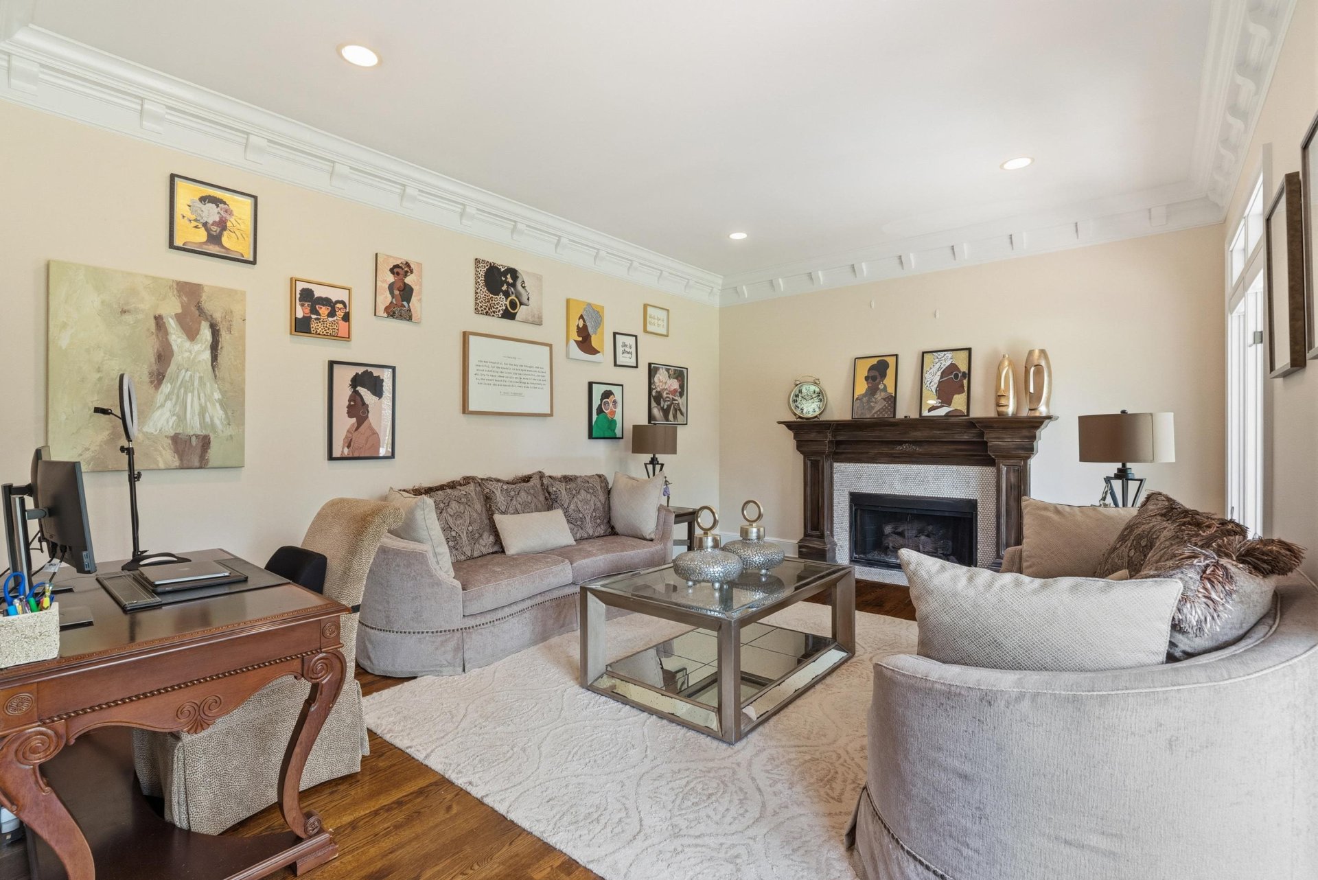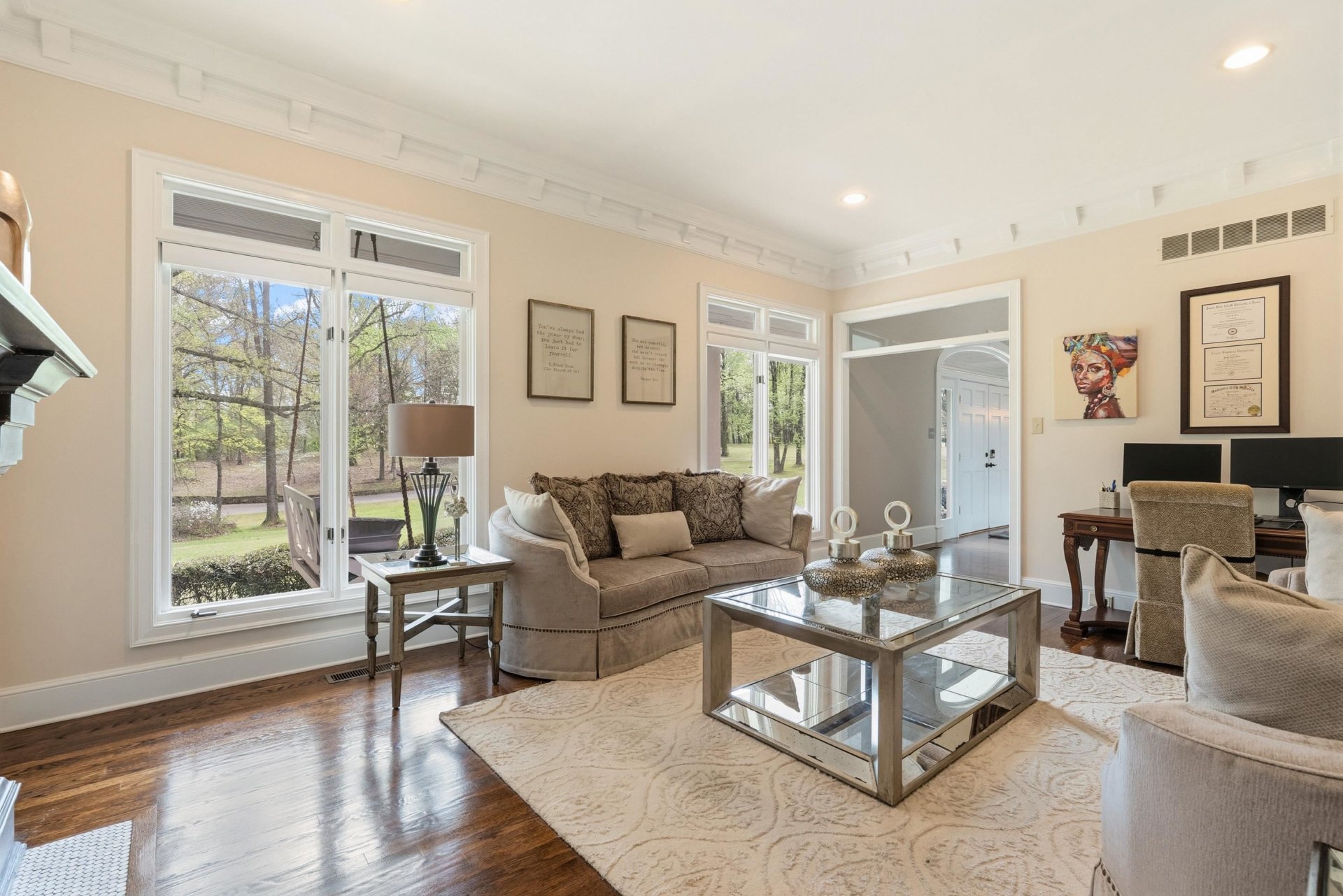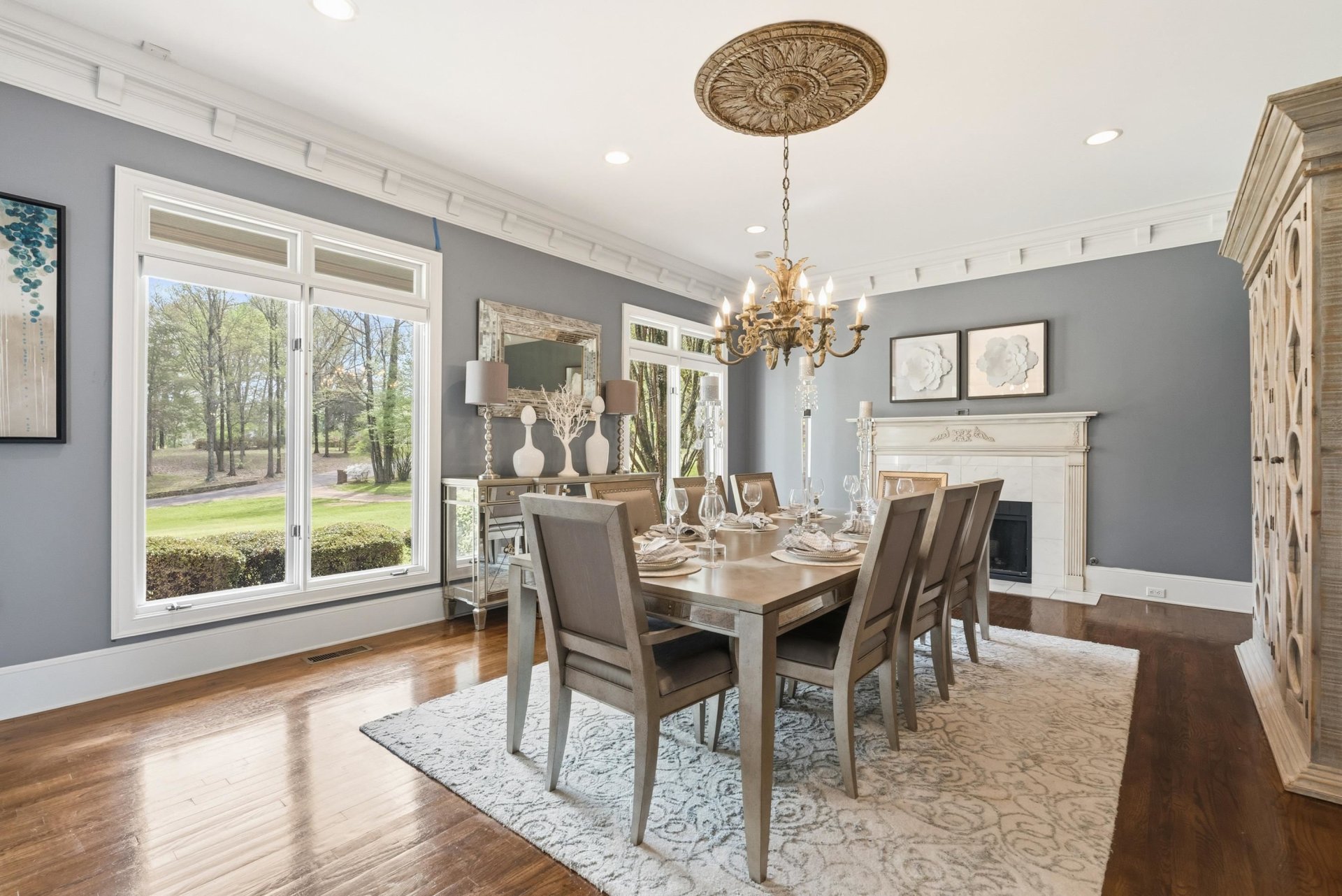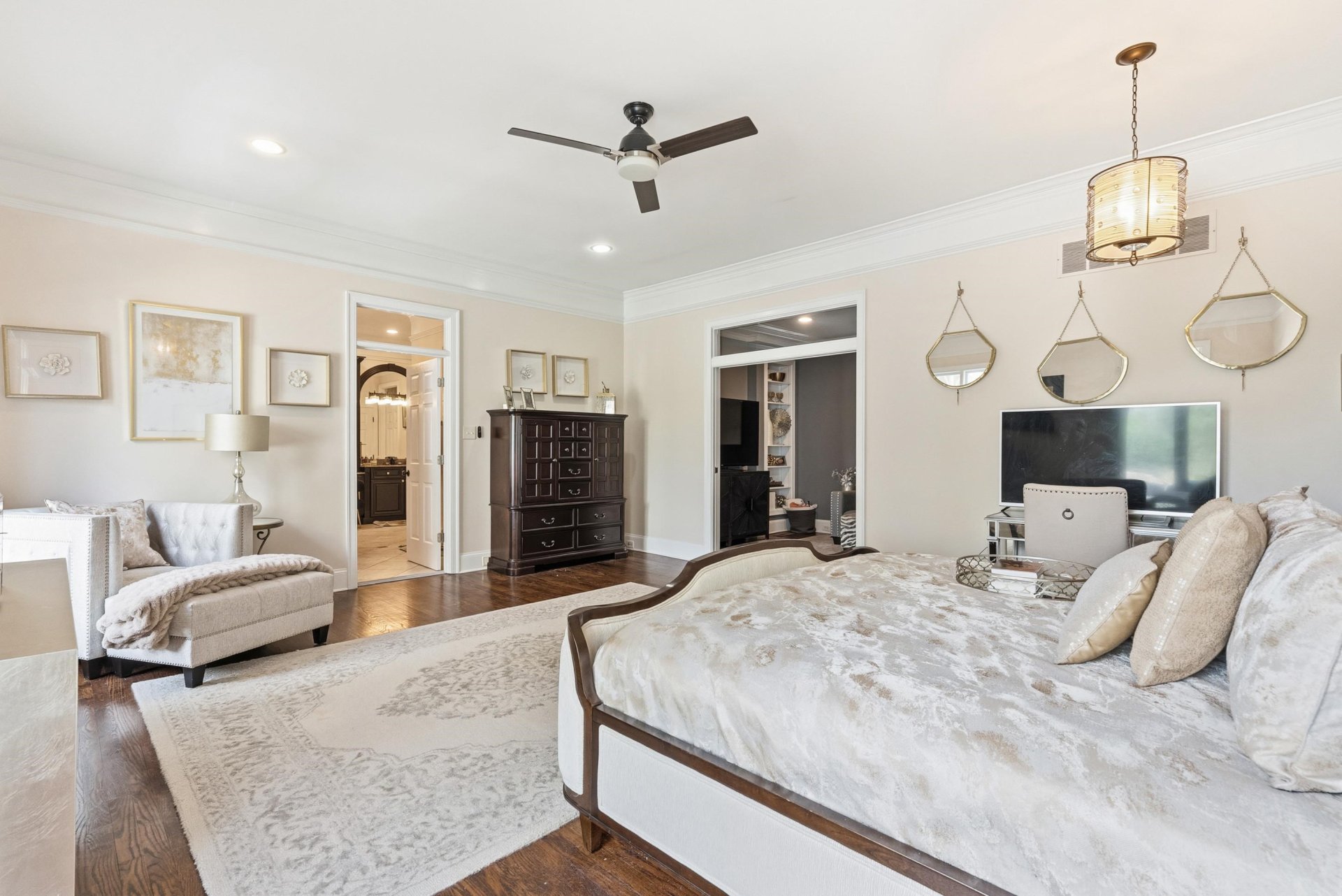 Southern charm and timeless luxury come together in this breathtaking lakefront estate set on a stunning 12-acre lake. A grand foyer makes a striking first impression, with a dramatic balcony overlooking both the foyer and expansive family room. The gourmet kitchen is designed for both everyday living and entertaining, featuring a large island with gas cooktop, double ovens, granite countertops, pantry, and a sunlit glass sitting area. Elegant dining room with fireplace, spacious family room with fireplace and built-in bookshelves, and richly appointed living spaces throughout. All four bedrooms offer private en suites. The luxurious primary suite includes a sitting room, spa-like bath, and oversized walk-in closet. Also featuring an office, upstairs study, and third-floor game room with bar. Outdoors, enjoy a resort-style gunite pool with waterfall, screened porch, and sweeping lake views.